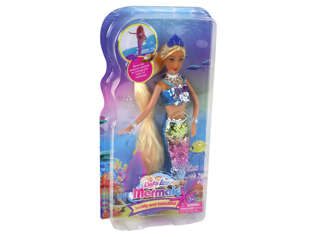 Дългата ѝ руса коса ѝ придава невероятен чар, а в комбинация с опашката създава впечатление за герой направо от приказка. Опашката е уникална с двулицевата си конструкция и ефектни пайети. Благодарение на тях, нашата кукла придобива магичен характер. Освен това, движението по пайетите предизвиква смяна на цвета от син към сребрист, наподобяваща красиви люспи. Това е впечатляващ ефект, който добавя чар и мистерия на тази кукла.