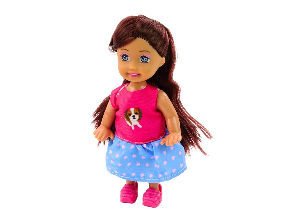 Куклата с дълга кафява коса, облечена в модерна розово-синя рокля и розови обувки, е готова за приключения със своите пухкави приятели.