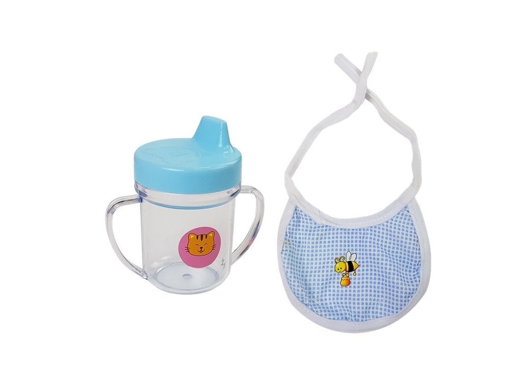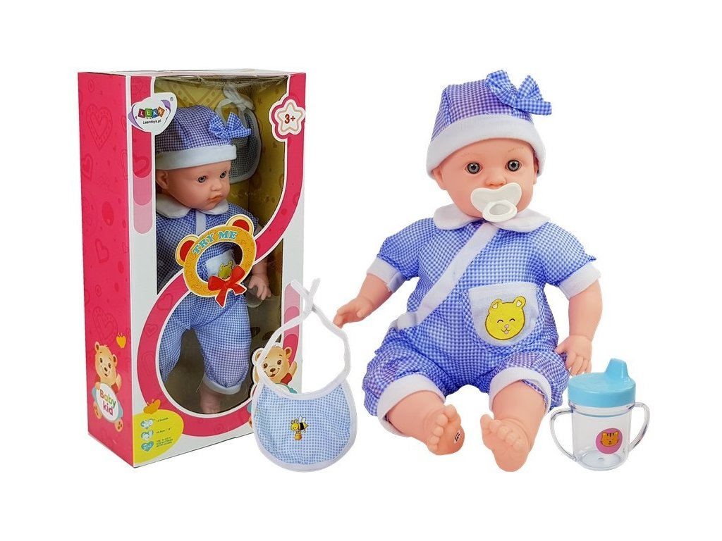Куклата със синьо облекло и аксесоари има сияйно и мило лице с големи очи. Изработена е от издръжливи и здрави материали. Куклата е облечена в синьо-бяло пижамено облекло. Дрехите са лесни за сваляне и пране, което улеснява поддържането на чистота. В комплекта са включени биберон, бяла залъгалка и синя лигавничка. Куклата издава 12 различни звука.