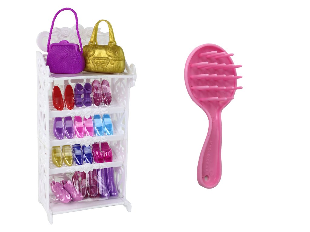 И това не е всичко! Комплектът включва и елегантен бял гардероб с 12 чифта обувки на ток. Куклата разполага с до 5 различни официални рокли – бяла, лилава, тъмнорозова, синя и светлорозова, всички с тюлени детайли и блестящи орнаменти. Също така комплектът е богат на аксесоари като 2 чифта сребърни обеци, 2 чантички (лилава и златиста), 3 колиета, фибичка за коса и четка за разресване.