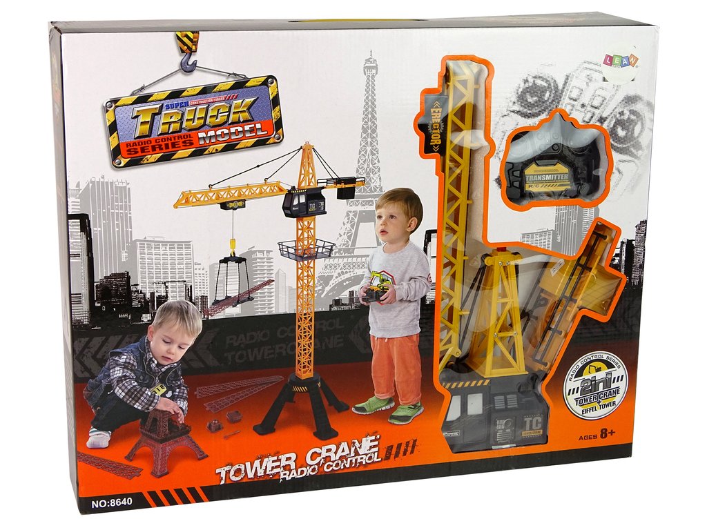 Комплектът включва кран с аксесоари, Айфеловата кула за самостоятелен монтаж и дистанционно управление за управление на крана.