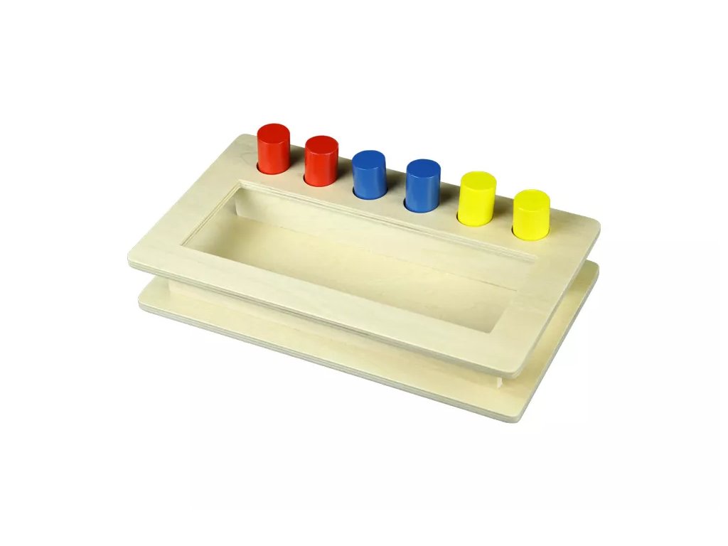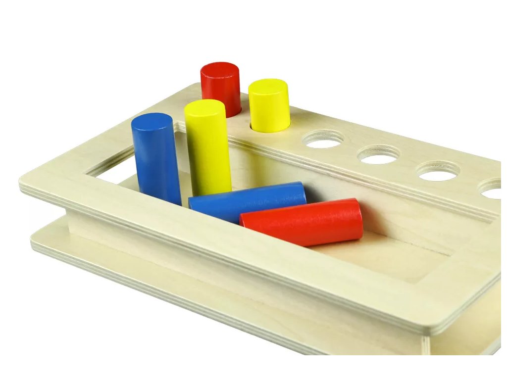Комплектът съдържа шест дървени валяка в три цвята. Децата ги поставят в отворите, като по този начин упражняват фината моторика и координацията око-ръка.