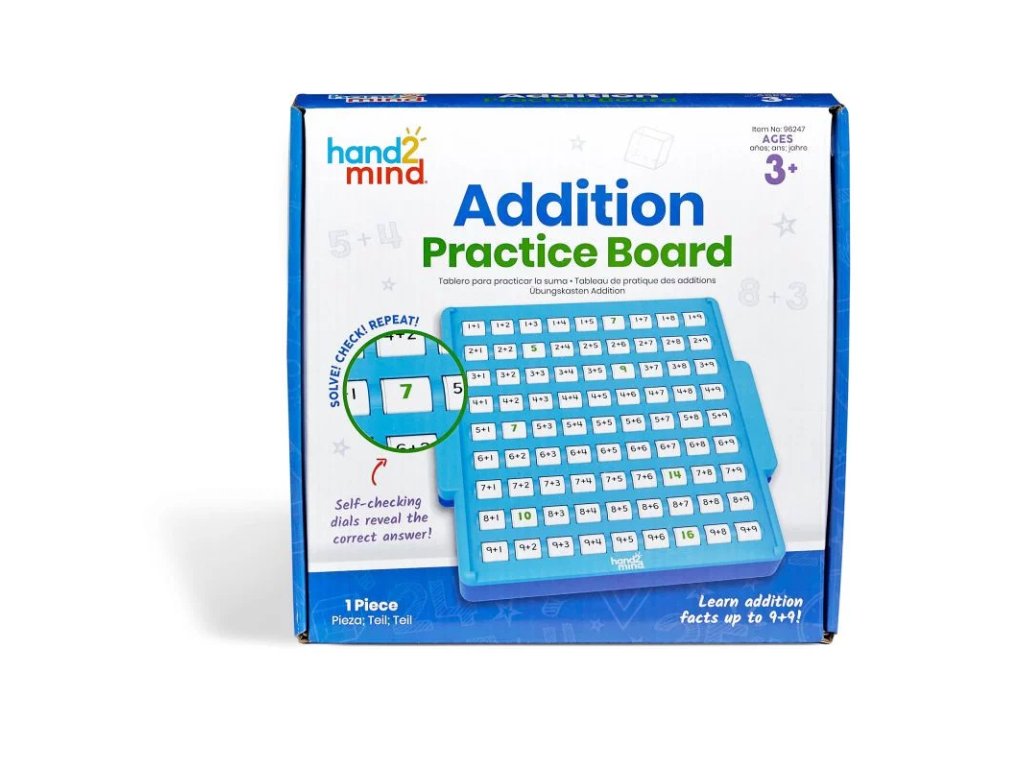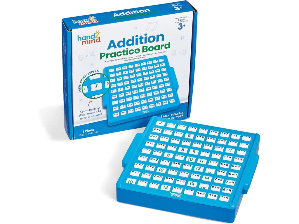 Самоконтролната таблица за събиране от британската образователна марка Learning Resources е инструмент за трениране на основни факти за събиране с възможност за незабавно проверяване на резултатите и същевременно лесно упражняване на допир.