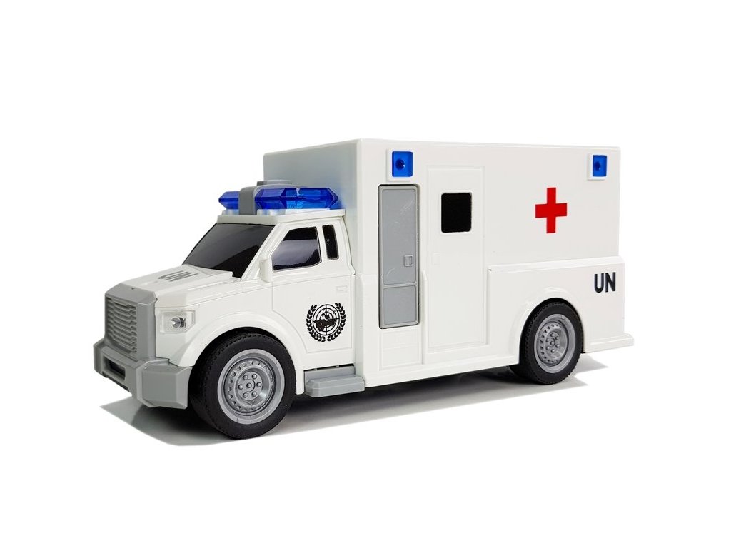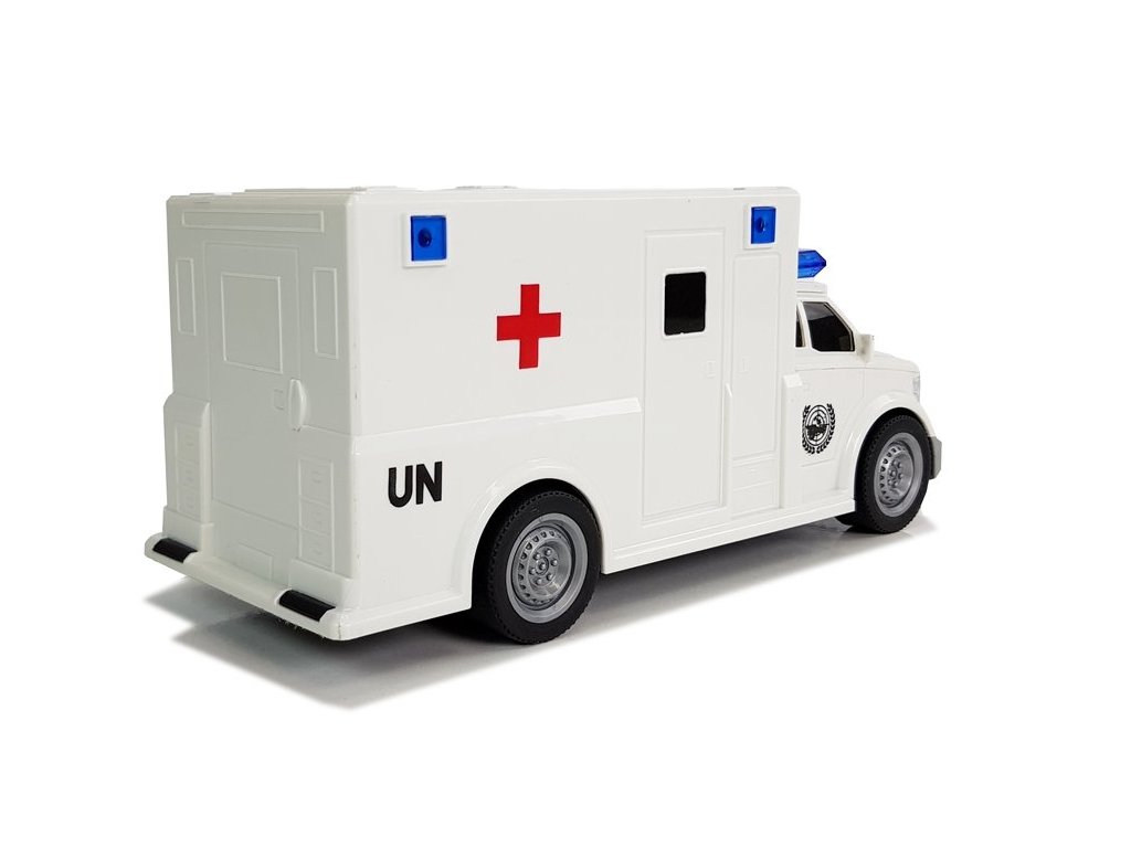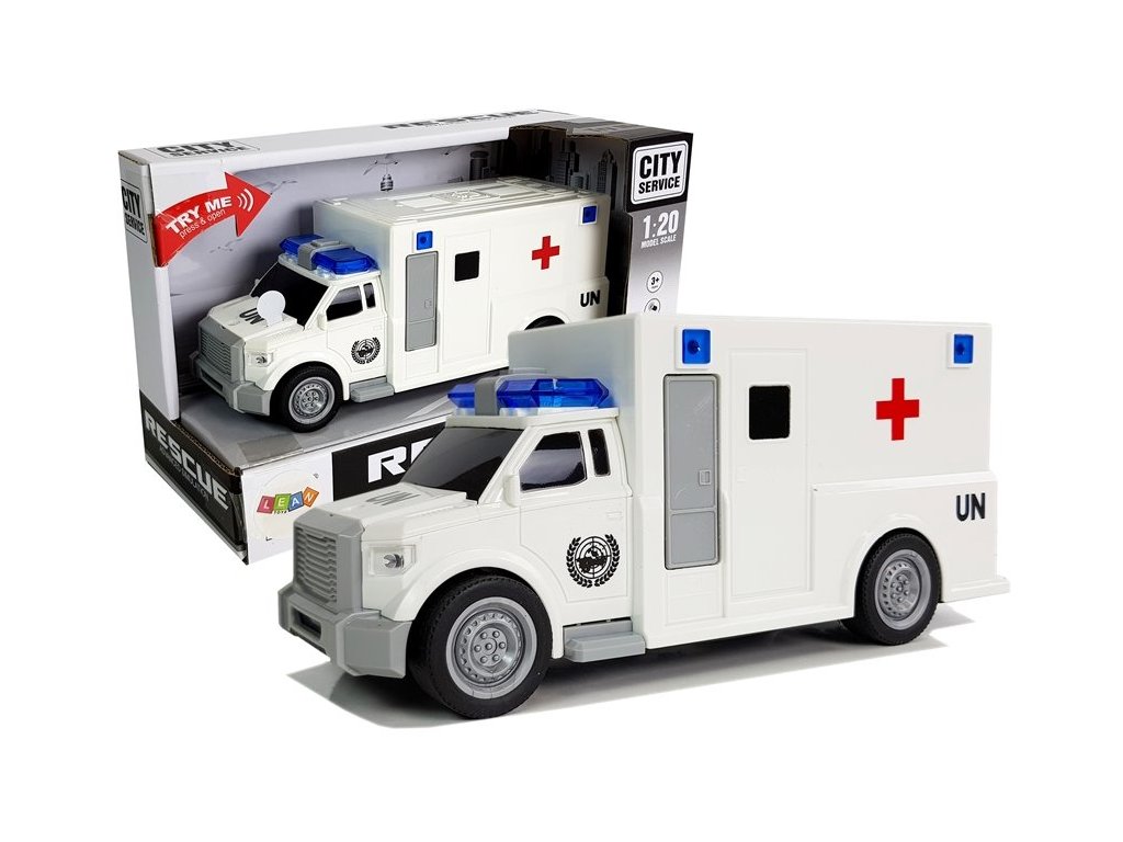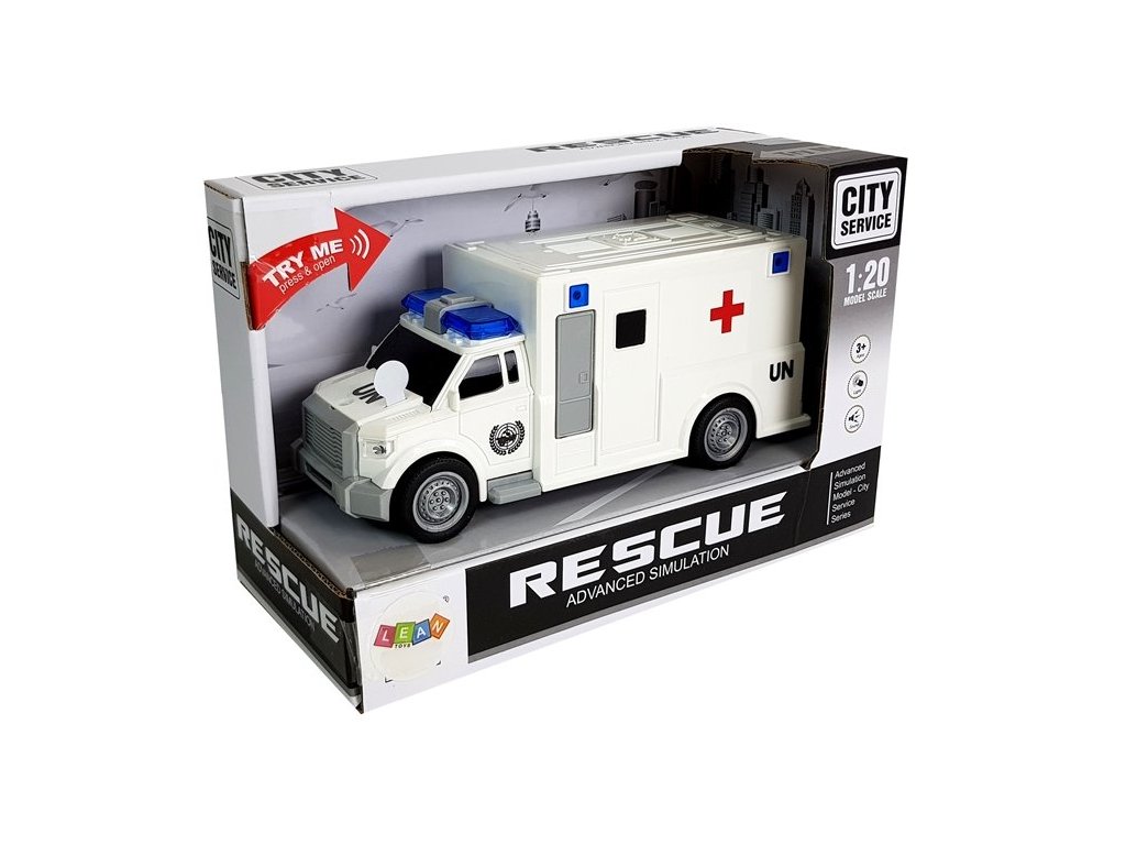 Лекарска кола с ефекти 1:20 бяла разполага със звук и светлинни ефекти, активирани с бутон, разположен върху покрива на превозното средство. Колата има мощен въртящ се задвижващ механизъм.
