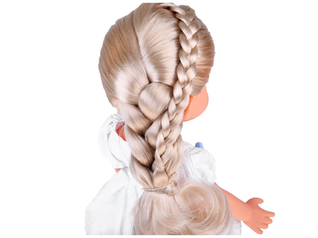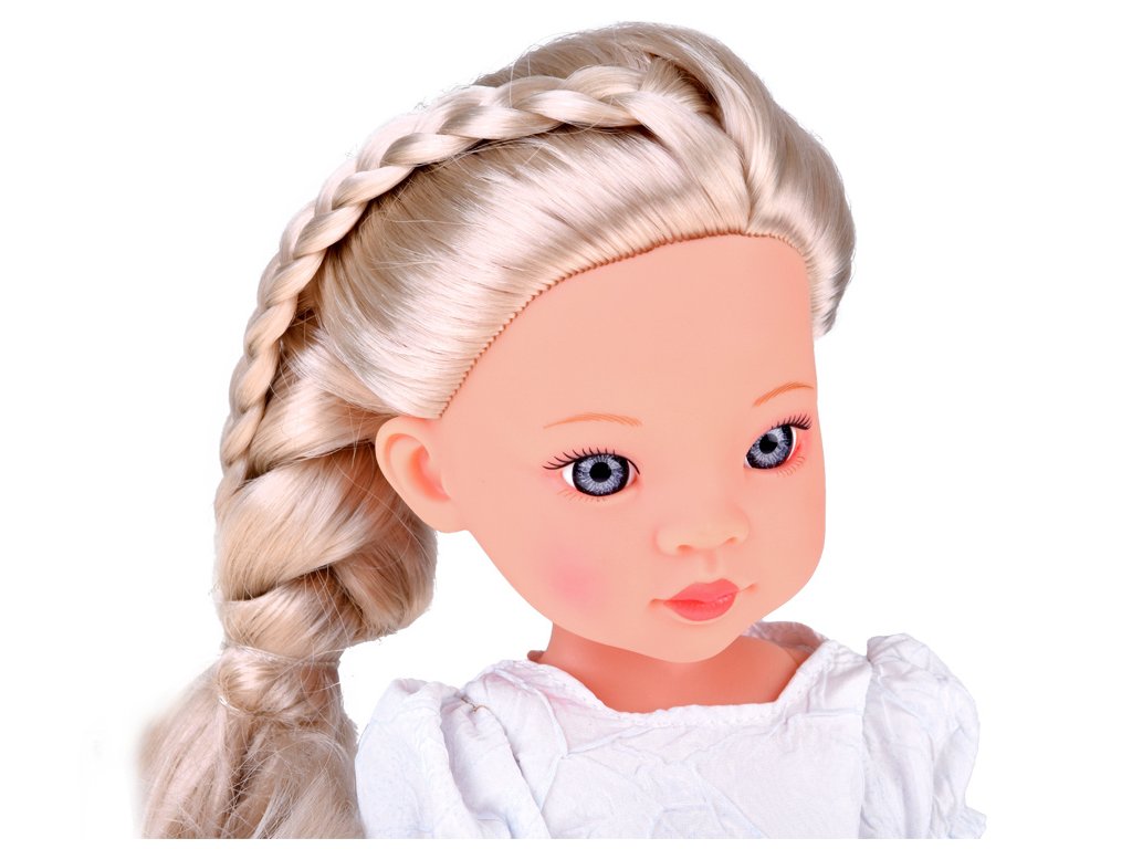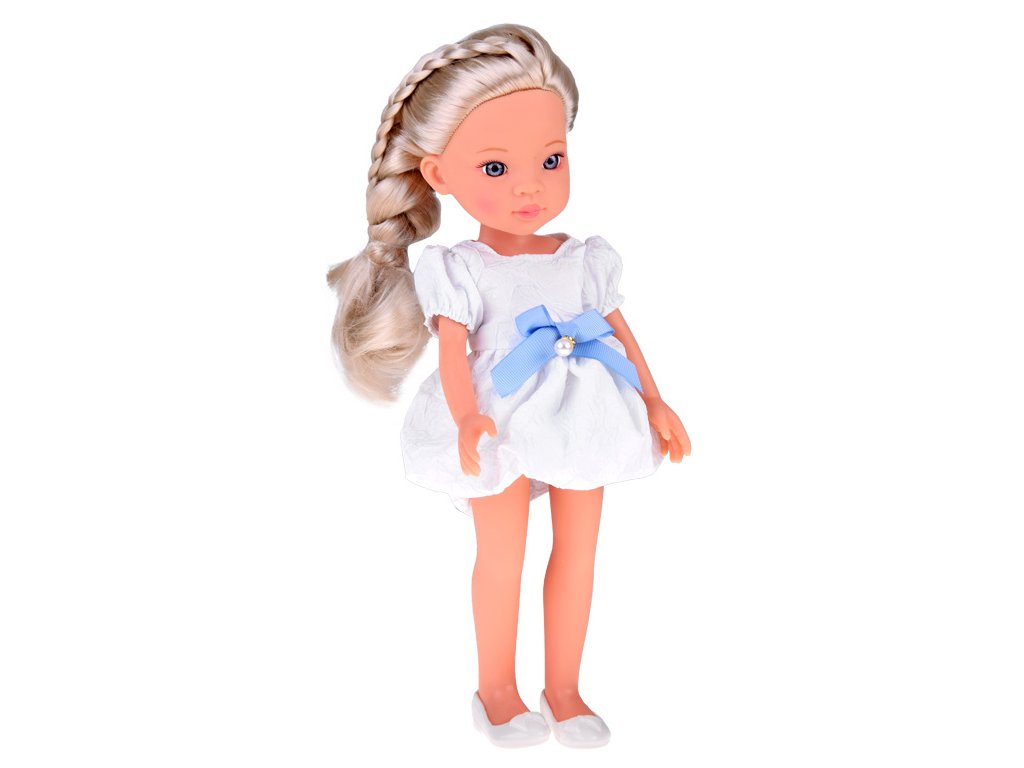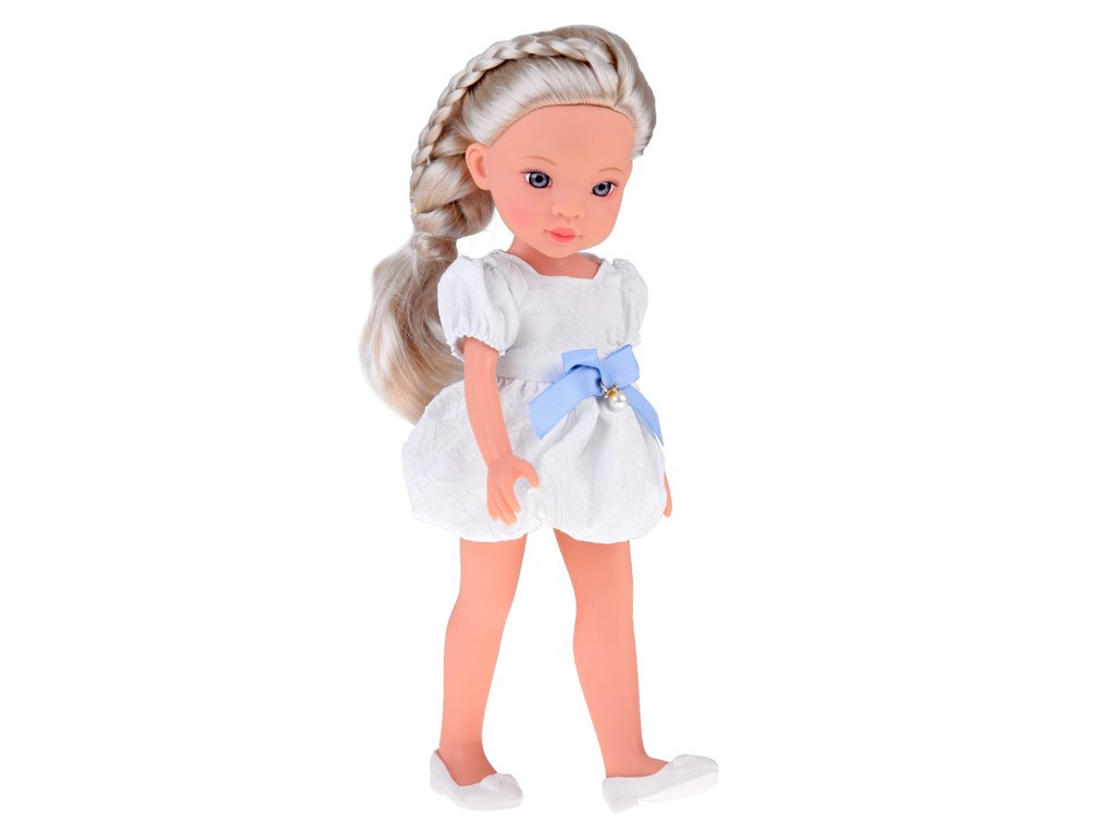 Тази елегантна кукла ще зарадва всяко момиченце! Тя има дълга светла коса, оформена в красива плитка, която може да се сресва и стилизира по много начини. Облечена е в красива бяла рокля, украсена със синя панделка с перла и бели балеринки, които допълват нейната уникална визия.