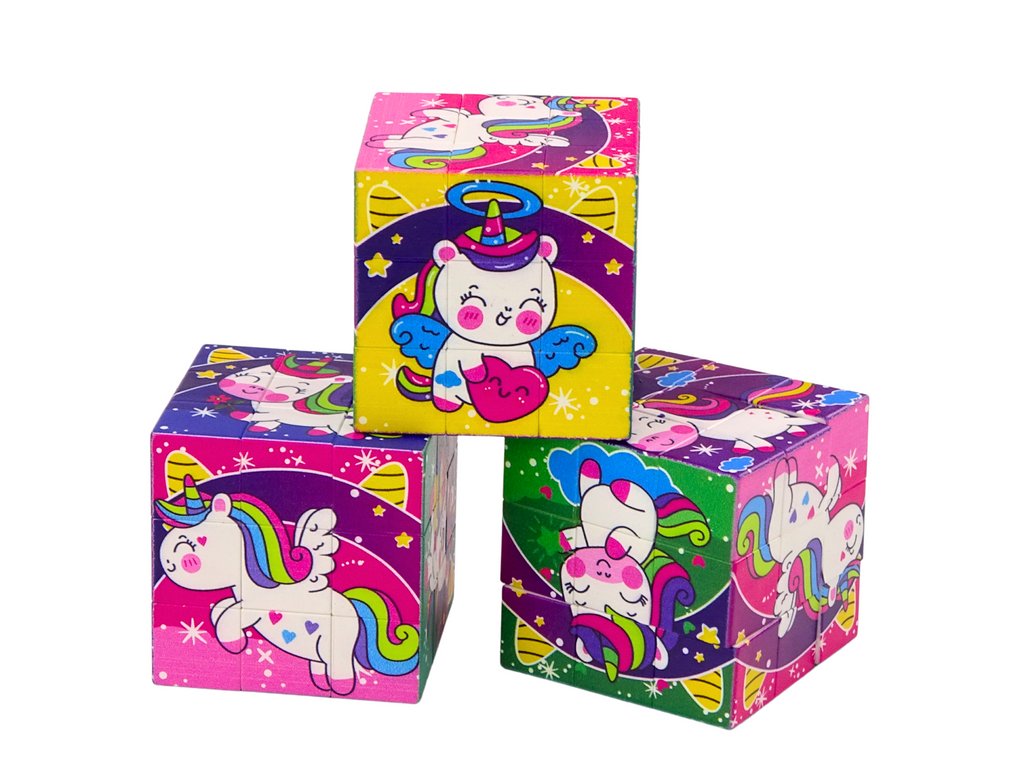Играчката е магичен куб за подреждане, който пренася децата в света на сладките еднорози и забавлението. Всяка страна на кубчето е декорирана с изображение на еднорог и цветове, като всяка страна съдържа 9 полета.