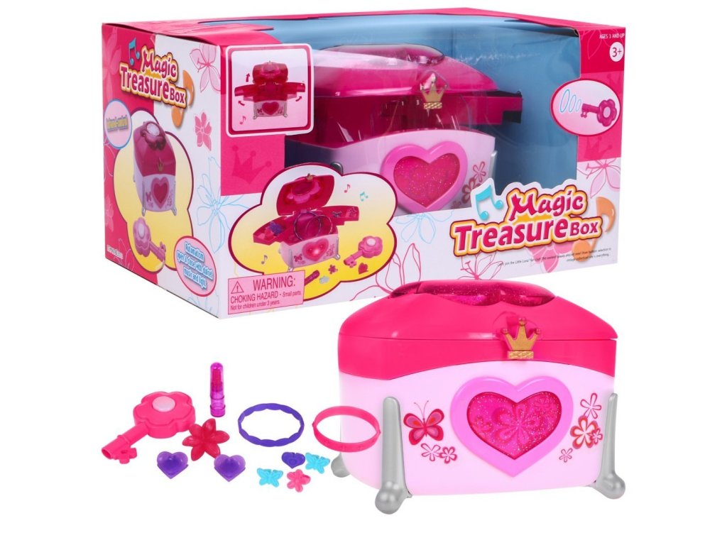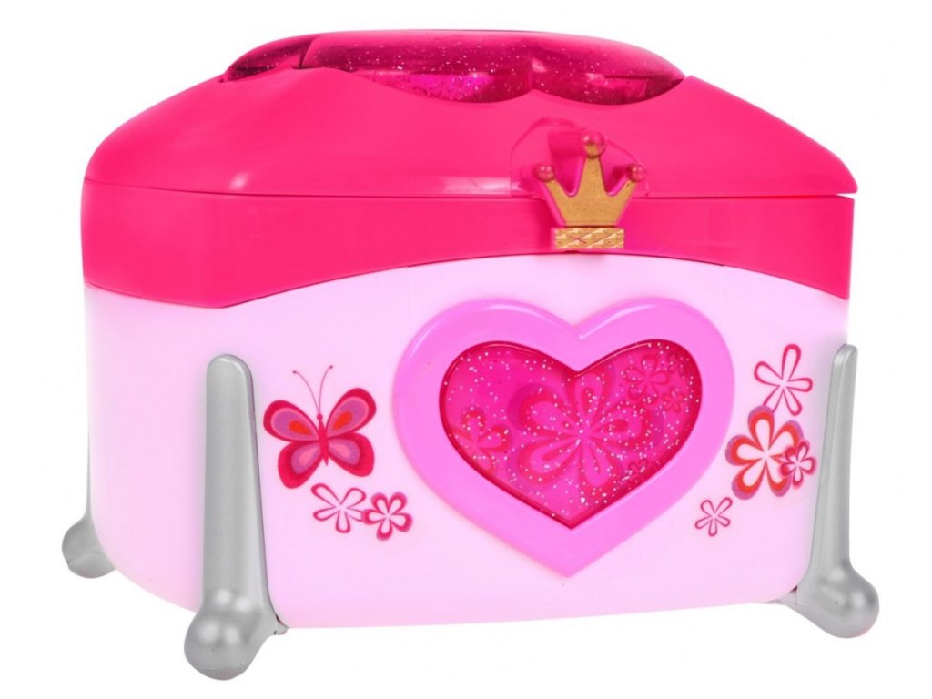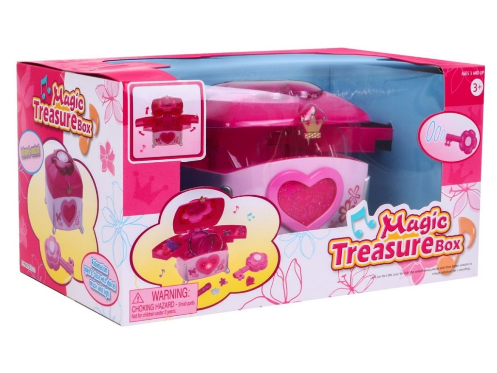 Красиво изработено, цветно куфарче с блестящо сърце. Куфарчето може да се отключва и заключва с ключ, придружено е от звуци, приятни за ухото. Вашето момиченце може да се почувства като истинска принцеса с малко магия. Играчката е предназначена за деца над 3 години и разполага с CE сертификат. Играчката работи с 3 x AA батерии (не са включени в комплекта).