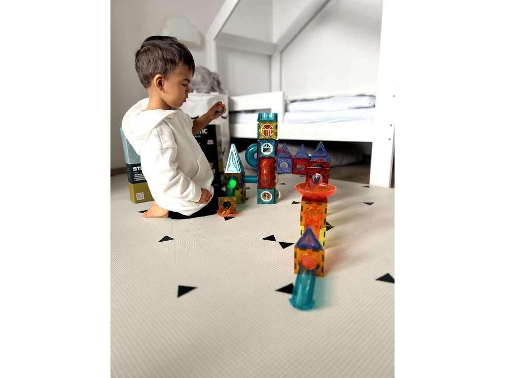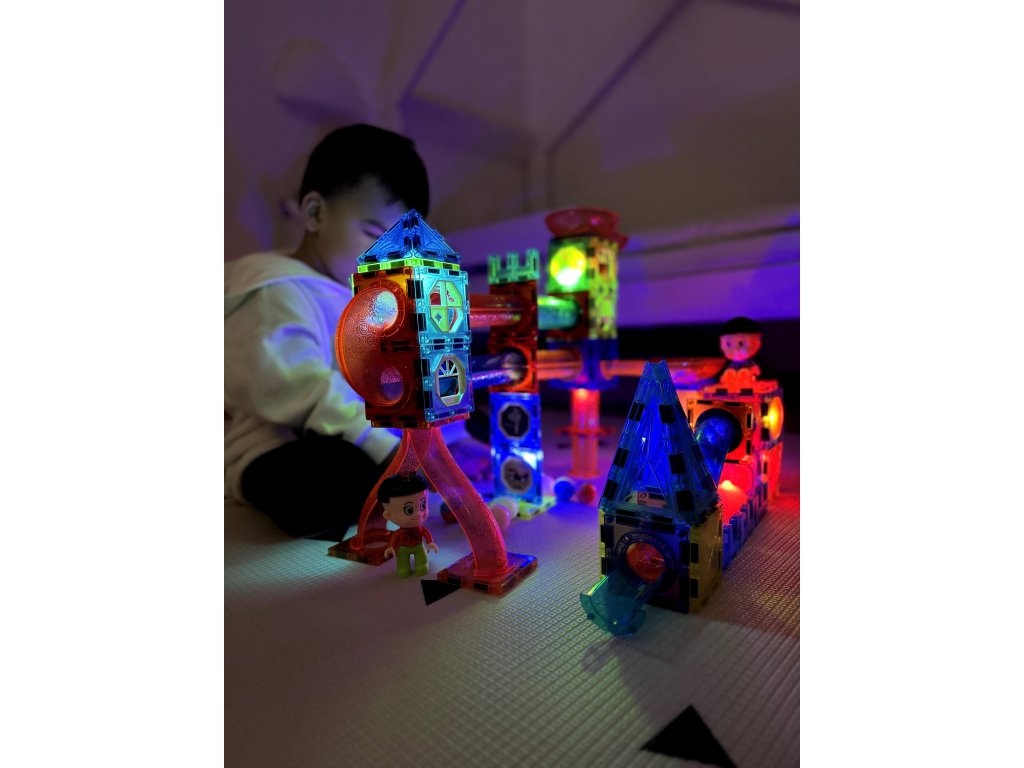 Магнитен светещ конструктор състезателна писта 150 части е отлична образователна играчка, която развива детското въображение, учи на търпение и концентрация. В инструкциите, включени в комплекта, са показани различни варианти на писта. Някои компоненти са със вградена LED светлина, което придава на играчката уникален и привлекателен вид.