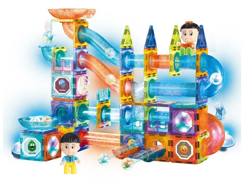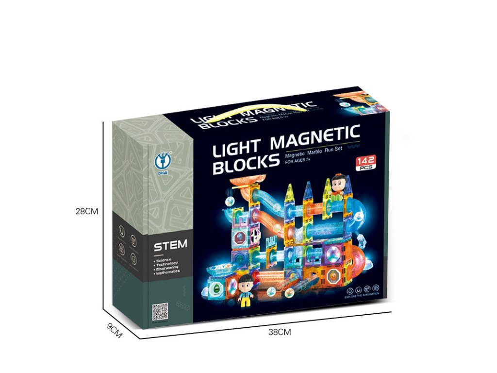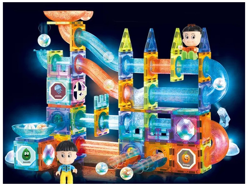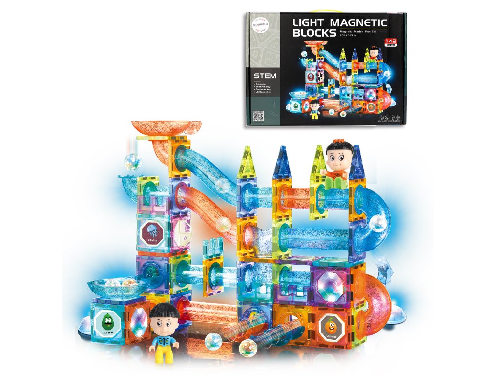 Магнитният светлинен строителен комплект с топчета, 142 части е отлична образователна играчка, която развива детското въображение, учи на търпение и концентрация. В приложената брошура към комплекта са показани примери за писти. Някои компоненти са с вградена подсветка, за да направят играчката по-атрактивна и ефектна.