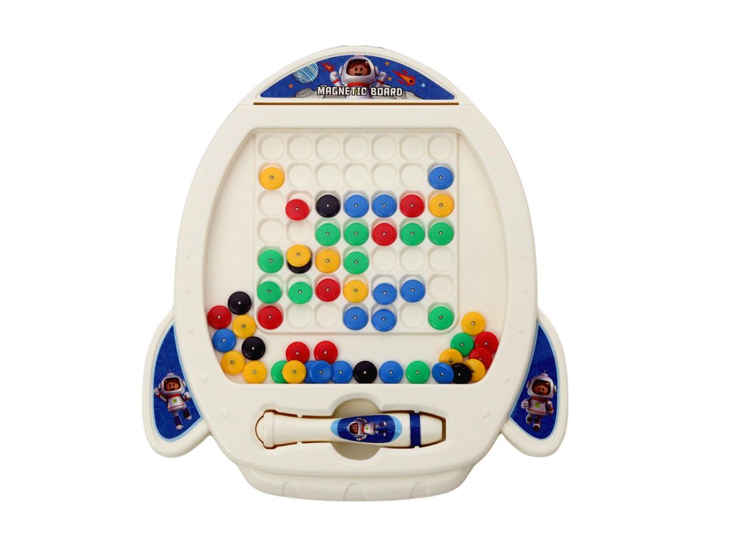 Тази изключителна магнитна дъска предлага неограничено пространство за малките художници. Комплектът включва цветни топчета в нюанси на червено, жълто, зелено, синьо и черно, които стимулират създаването на фантастични картини и модели. Специалното магнитно стилус позволява на децата да манипулират свободно топчетата, развивайки прецизността на движенията и фината моторика.