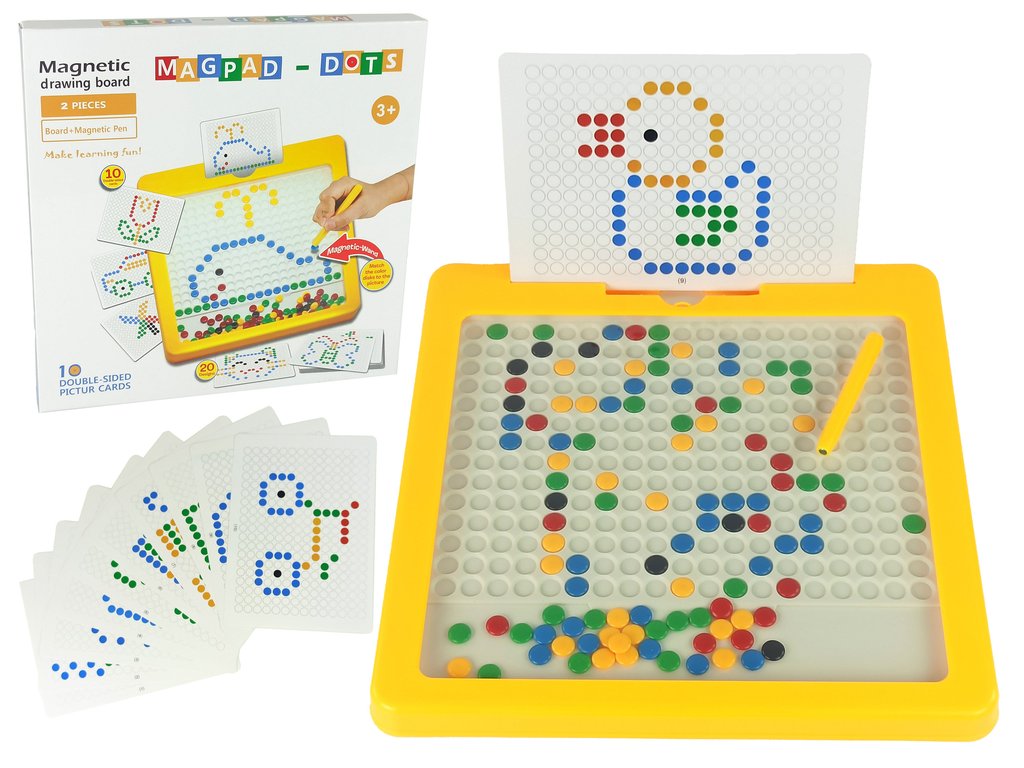 Тази жълта магнитна дъска с мъниста 100 бр. жълта е уникална със своите креативни и интерактивни възможности. Комплектът включва до 100 цветни мъниста в красиви нюанси на червено, жълто, зелено, синьо и черно. Освен дъската и мънистата, получавате и специално магнитно писалка, което ви позволява да местите мънистата навсякъде върху дъската.