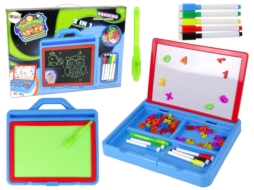 Магнитна дъска за рисуване 2в1 със светещи бои разполага с панел за рисуване с магически флумастери. Подсветката на флумастерите с LED светлини допълнително увеличава атрактивността на изрисуваните картини и гарантира, че те ще изглеждат страхотно дори в слабо осветена стая.