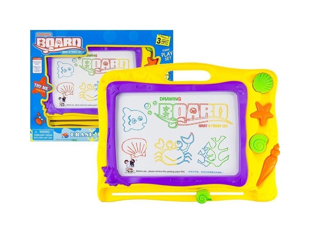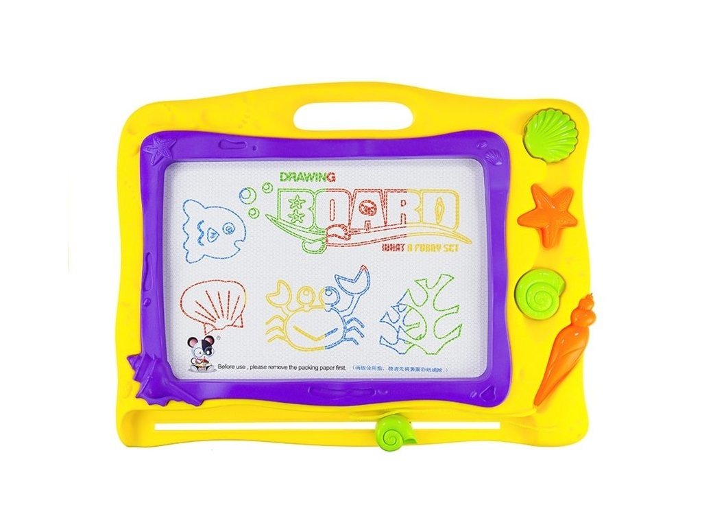 Магнитна дъска за рисуване с печати е универсална и лесна за използване играчка за всички деца. Детето развива естетическо възприятие и усъвършенства творческите си умения. Комплектът съдържа магнитна дъска за рисуване, магнитна писалка и 3 печата.