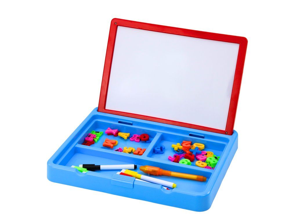 Дъската разполага с удобно отделение с 3 отделения, разположено под нея. Това е идеалното място за съхранение на рисувателни материали като маркери, магнитни букви или цифри, включени в комплекта. С тях децата могат да подреждат думи или да решават математически задачи, учейки се чрез игра и развивайки креативността си.