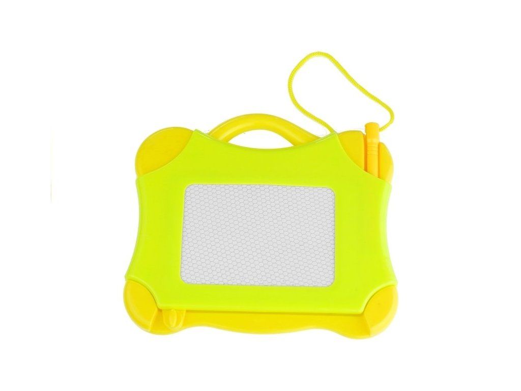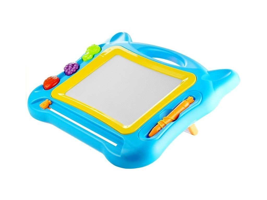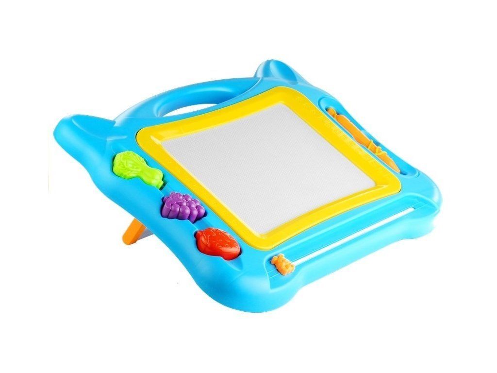 Магнитна дъска за триене с печати 2в1 е забавна и образователна играчка, която предлага безкрайни възможности за писане и рисуване за деца от 3 години. Комплектът включва голяма дъска с ергономична дръжка, специална писалка под формата на морков и три печата с формата на слънце, облаче и човече, които обогатяват творческата игра. Освен това има и по-малка преносима дъска, идеална за пътувания. Дъската позволява създаване на многоцветни рисунки.