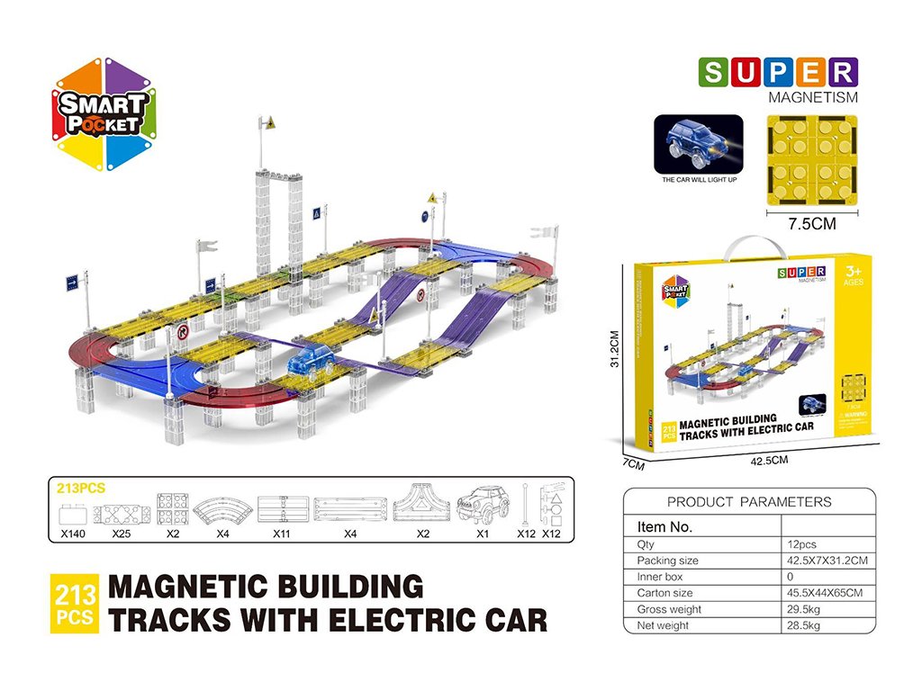 Комплектът съдържа 213 магнитни части, включително специални части за създаване на писта. Благодарение на силните магнити, панелите се свързват лесно, така че децата могат да експериментират с форми и височини на пистите. Електрическата кола се движи сама по целия маршрут, което носи страхотно преживяване от движението и развива техническото мислене.