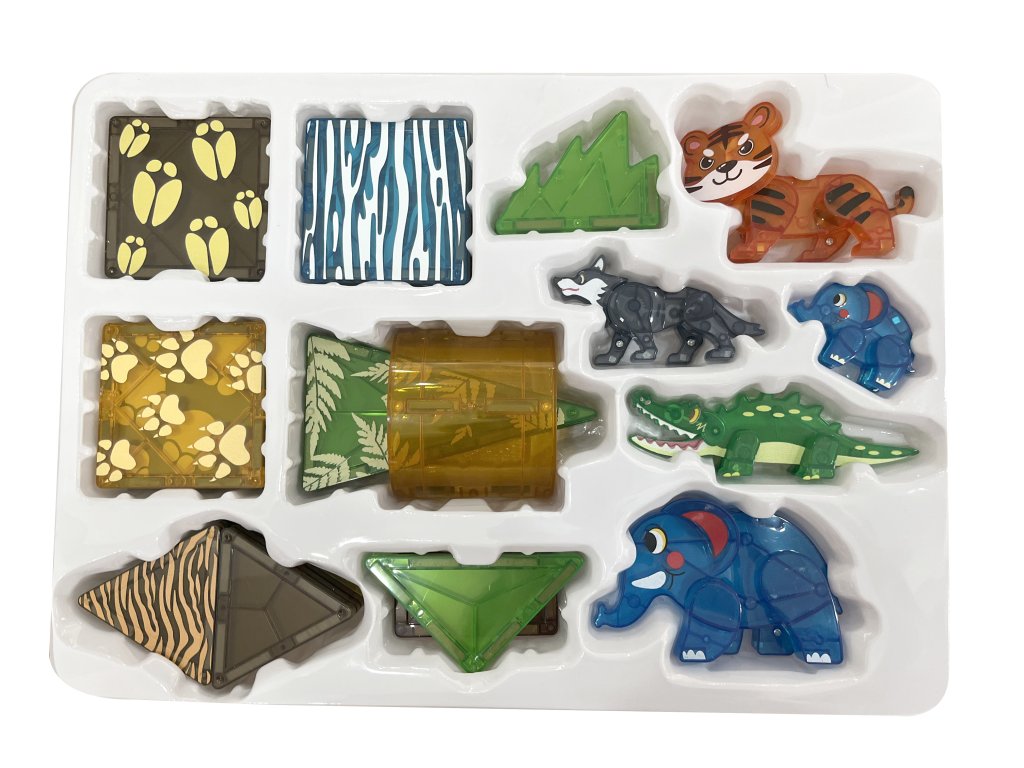 Приключенският магнитен конструктор с големи 7,5 см части ще въведе децата в света на дивата джунгла, пълна с цветни животни. Комплектът съдържа 45 магнитни части с различни форми и весели мотиви, които позволяват изграждането на тропически колиби, скривалища, драконови пещери или цяло кралство в джунглата. Включени са и фигурки на животни, които ще придадат жив характер на всяка конструкция.