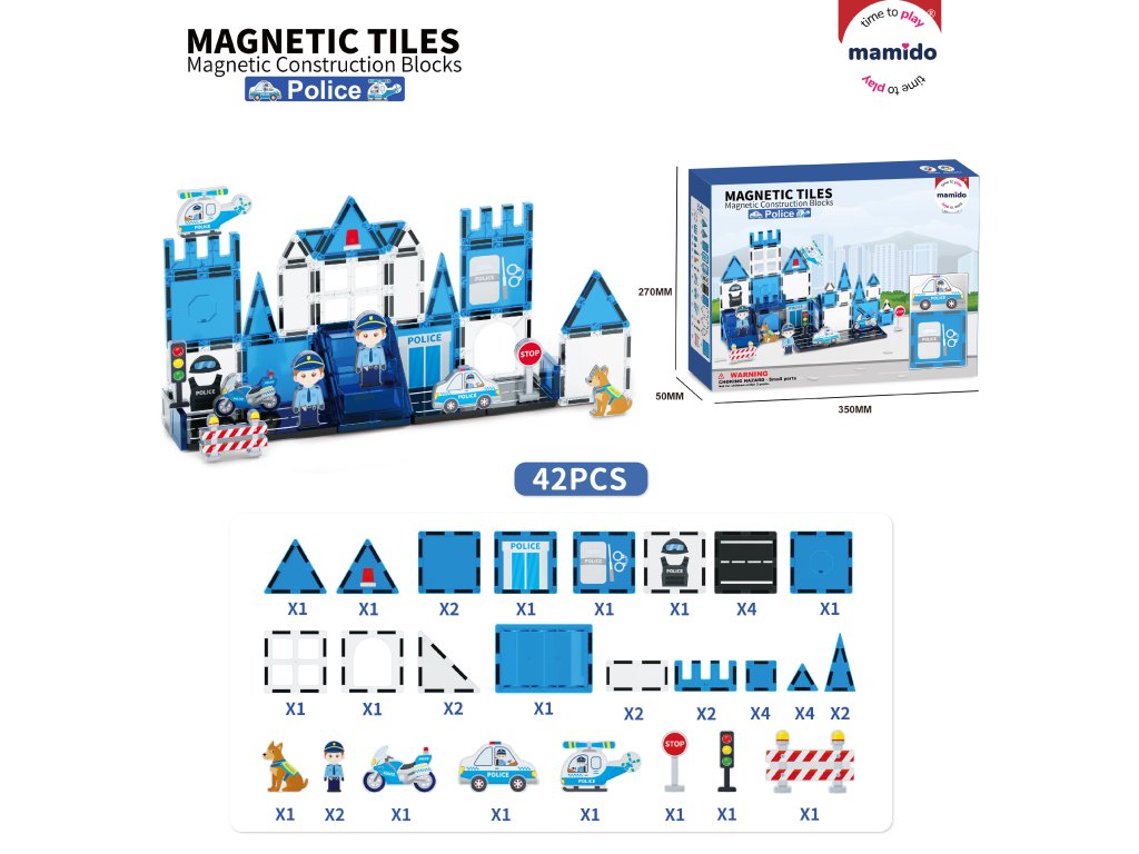 - Включва: магнитни блокчета, полицейска фигурка, колички, хеликоптер и други