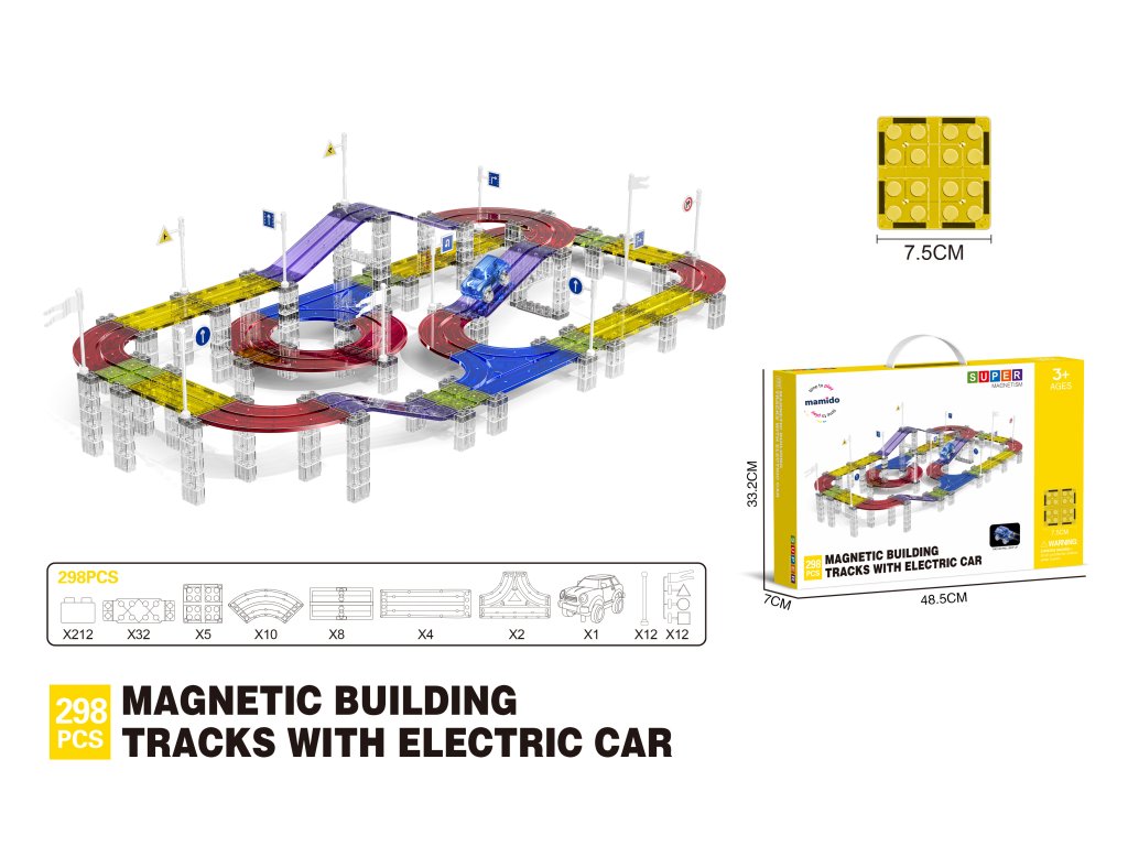 Комплектът съдържа 298 магнитни части, включително специални части за създаване на писта. Благодарение на силните магнити, панелите се свързват лесно, така че децата могат да експериментират с форми и височини на пистите. Електрическата кола се движи сама по целия маршрут, което носи страхотно преживяване от движението и развива техническото мислене.