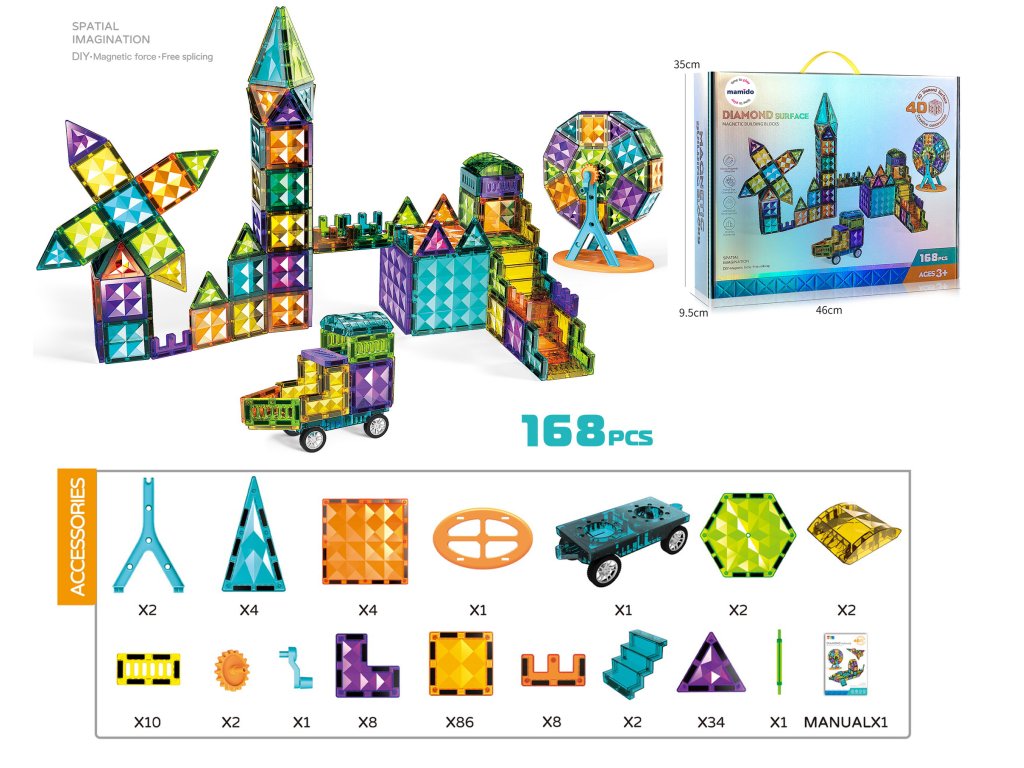 Открийте безкрайните възможности за творчество с магнитния конструктор от 168 части. Цветните прозрачни кубчета с диамантена повърхност се свързват лесно благодарение на силните магнити и позволяват изграждането на високи замъци, мостове, кули и превозни средства. Децата развиват креативност, пространствено въображение и фина моторика по време на игра.