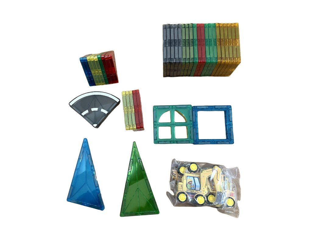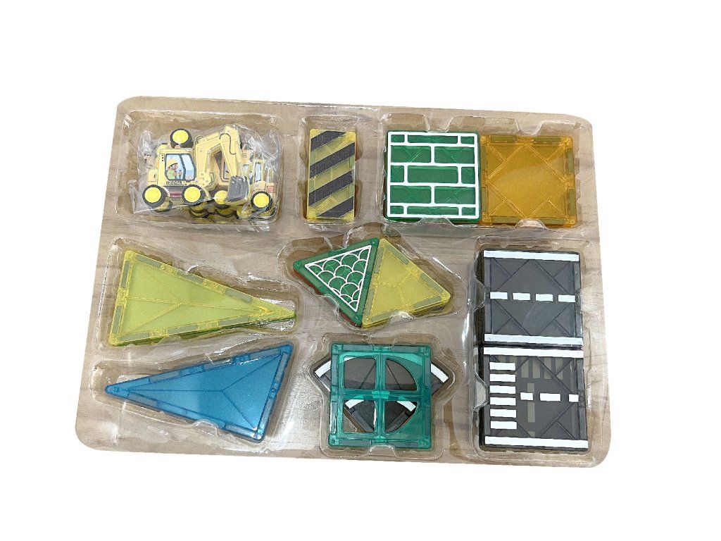 - Включва: магнитни кубчета, пътни елементи, пътни знаци, колички и други аксесоари
