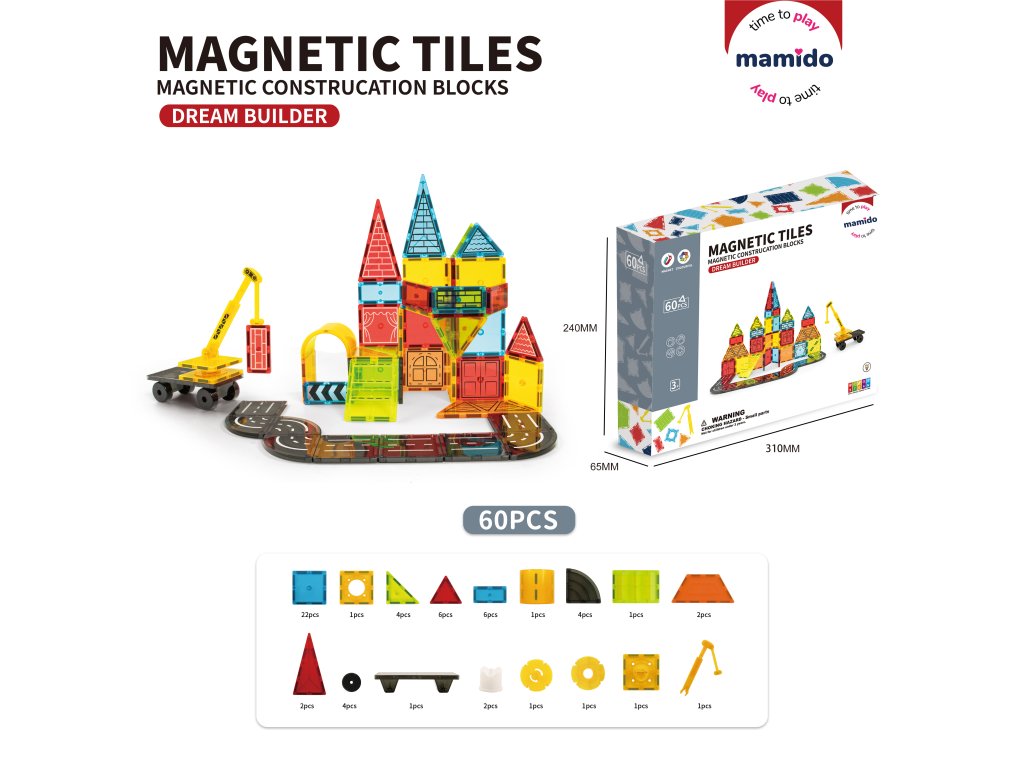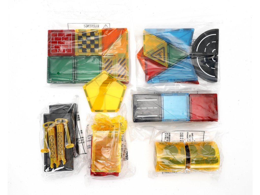 - Включва: магнитни кубчета, пътни елементи, пътни знаци, кран, колички и други аксесоари