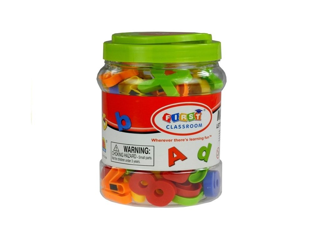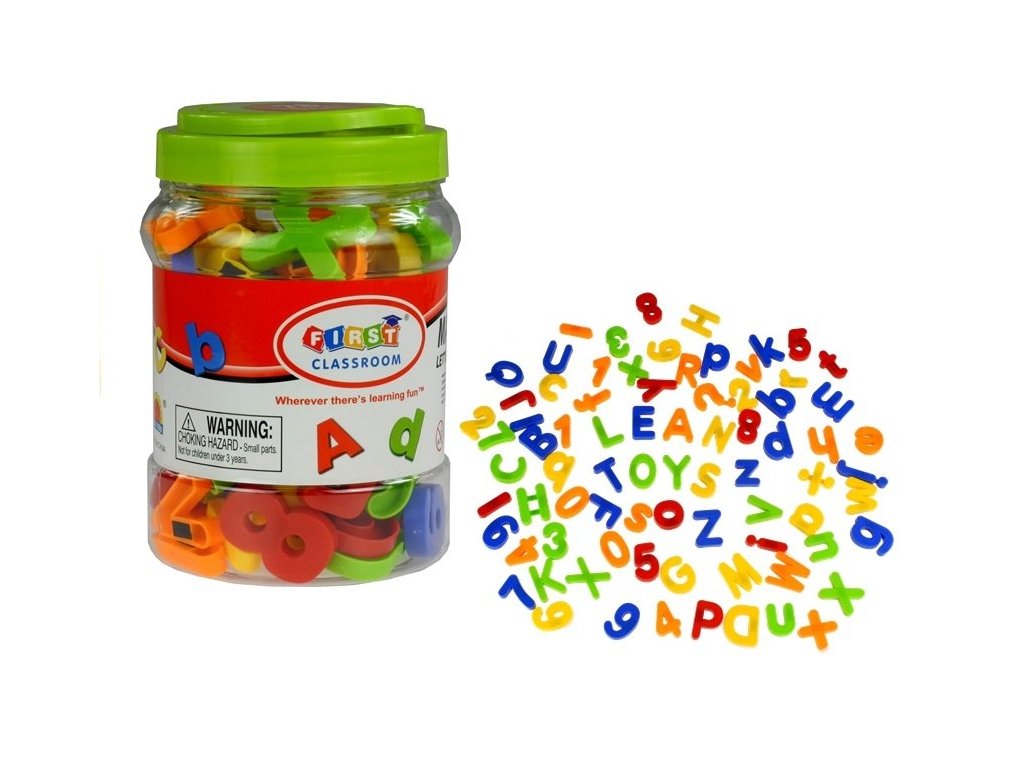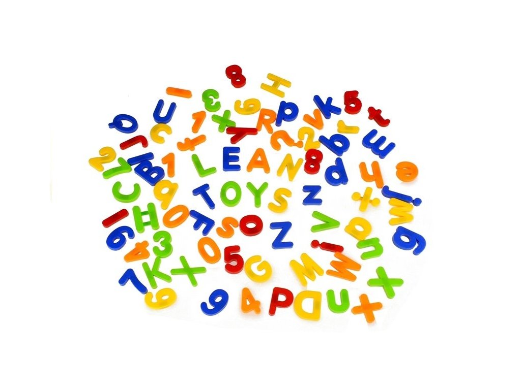 Голяма кутия съдържа 79 магнитни букви, цифри и математически знака. Благодарение на тази практична обучителна играчка лесното съставяне на прости думи или математически задачи ще бъде истинско удоволствие. Цветните магнити се захващат здраво върху всякакви метални повърхности – детето може да ги постави на магнитна дъска или хладилник. Приятните цветове на цифрите и буквите улесняват разпознаването им от детето и го мотивират за игра. Магнитите са изработени от сертифициран безопасен пластмаса.