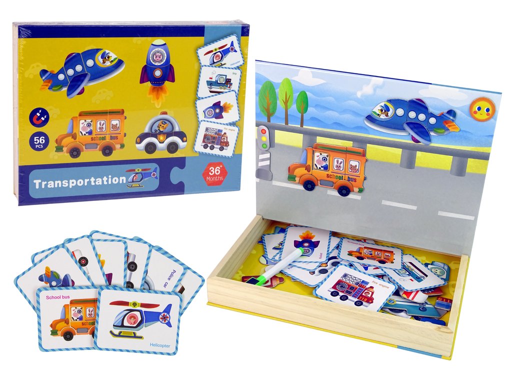 Комплектът съдържа карти с изображения на различни герои, а задачата на малчугана е да подреди магнитните елементи на превозното средство според шаблона, така че да възпроизведе точно дадената картина. Пъзелите ще служат дълго на детето благодарение на възможността за създаване на различни креативни изображения. Маркерът позволява да се добавят или рисуват собствени елементи. Това пробужда у детето художественото чувство и упражнява логическото мислене.