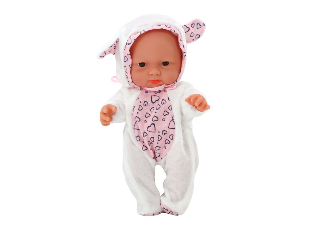 Очарователна малка бебешка кукла! Тази миниатюрна кукла с размери 21 см x 14 см е идеалният спътник за всяко малко момиченце. Облечена е в красиво бяло облекло, украсено със сърчица, които придават допълнителна нежност и сладък вид.