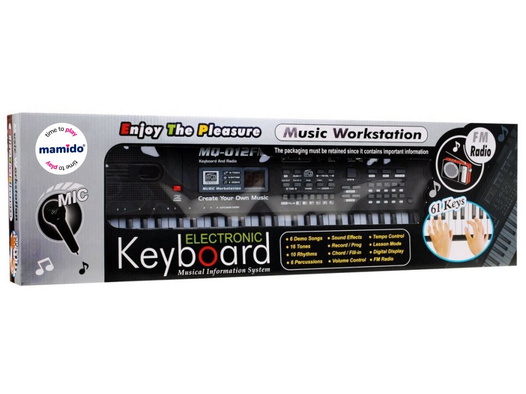Mamido Детски клавиатура с микрофон радио записване 61 клавиша черен е многофункционален музикален инструмент, който развива въображението, усещането за ритъм, фината моторика на ръцете и слуха. Той също така подпомага пробуждането на любов към музиката у малките музикални ентусиасти. Преносимата клавиатура разполага с множество функции, които носят много радост на децата. Музикалният комплект включва микрофон и захранващ адаптер. Клавишите предлагат избор между 2 обучителни програми за свирене. Продуктът е подходящ за деца над 3 години и разполага с CE сертификат.
