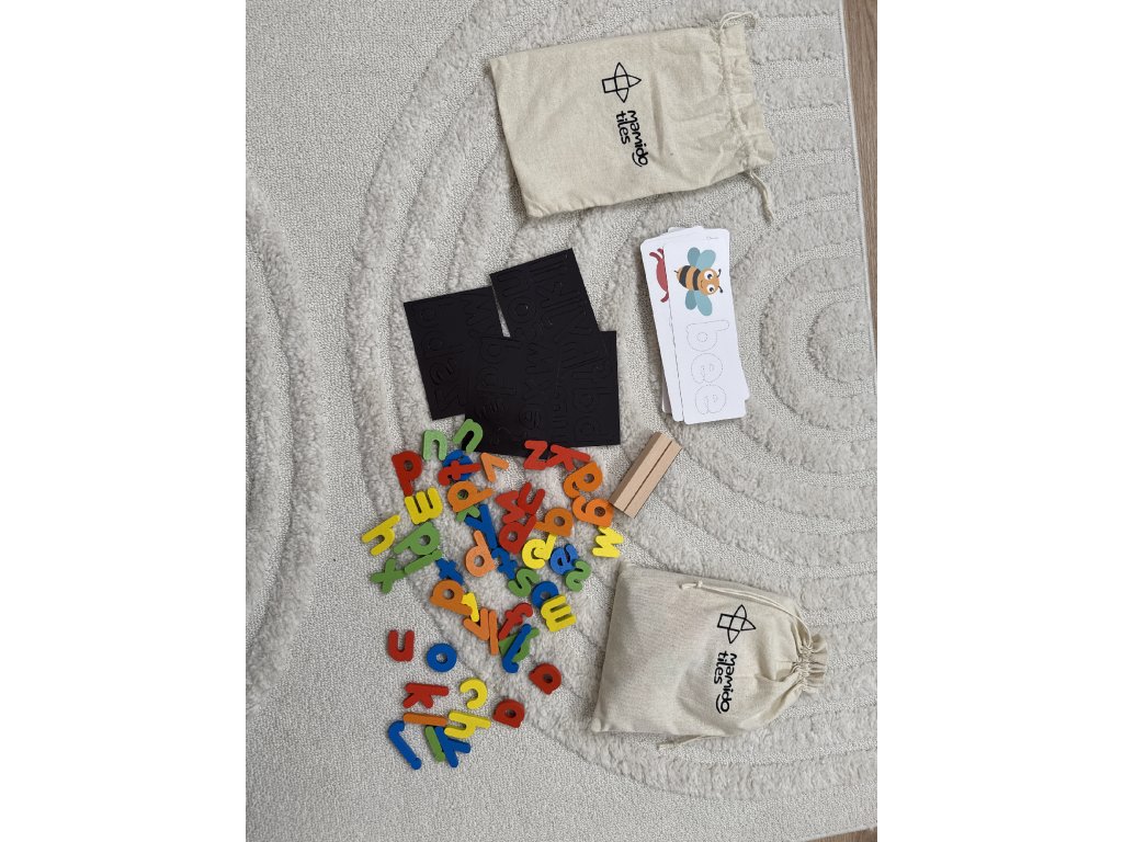 Целият комплект е съхранен в практични текстилни торбички, така че сте сигурни, че буквите и картите няма да изчезнат и могат да пътуват с вас навсякъде.