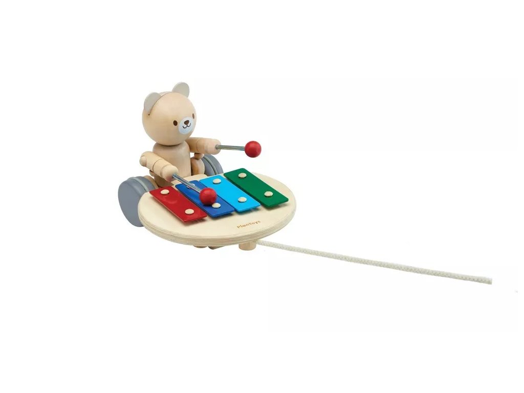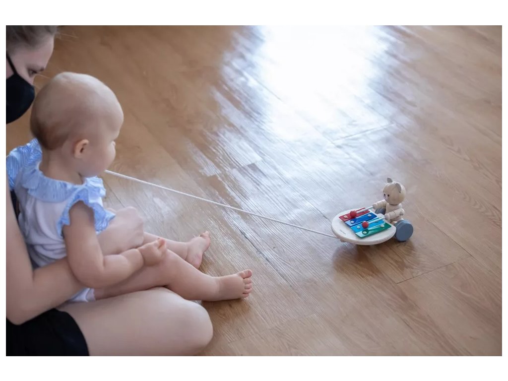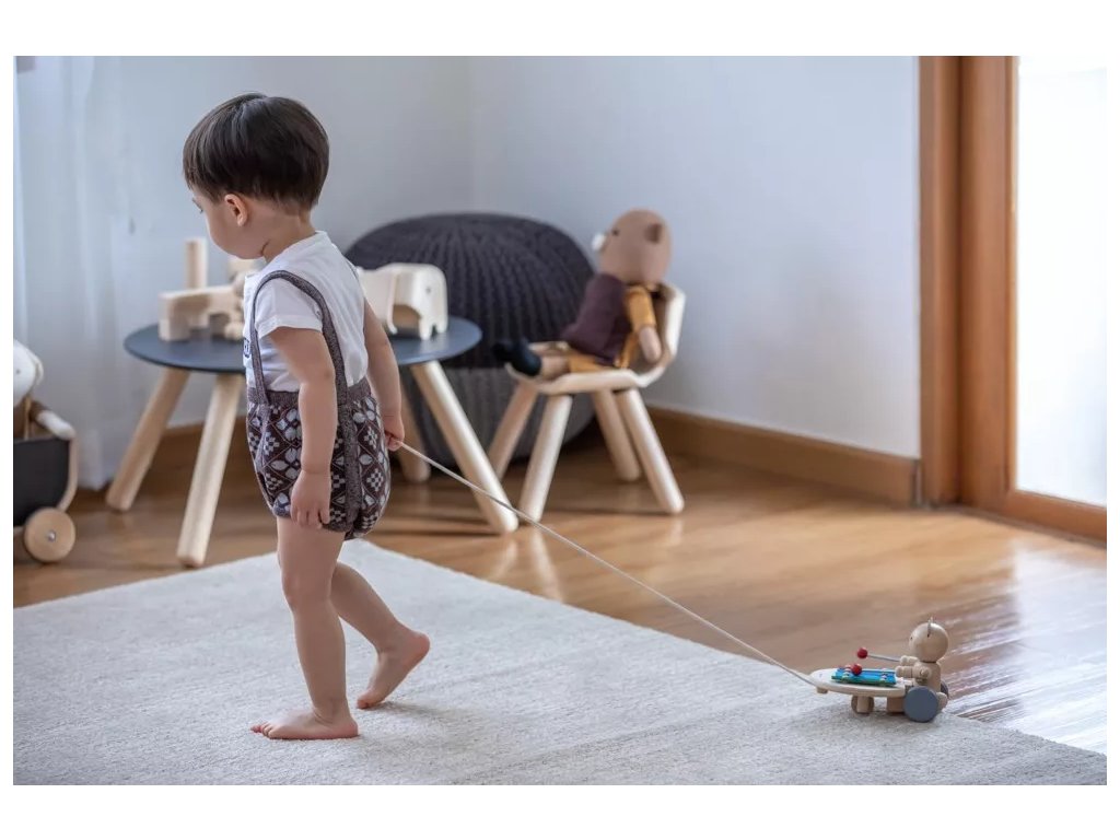 Дървена играчка за дърпане от PlanToys, която издава музикални звуци при дърпане и мотивира детето да ходи и да открива. Подходящо за деца над 12 месеца.
