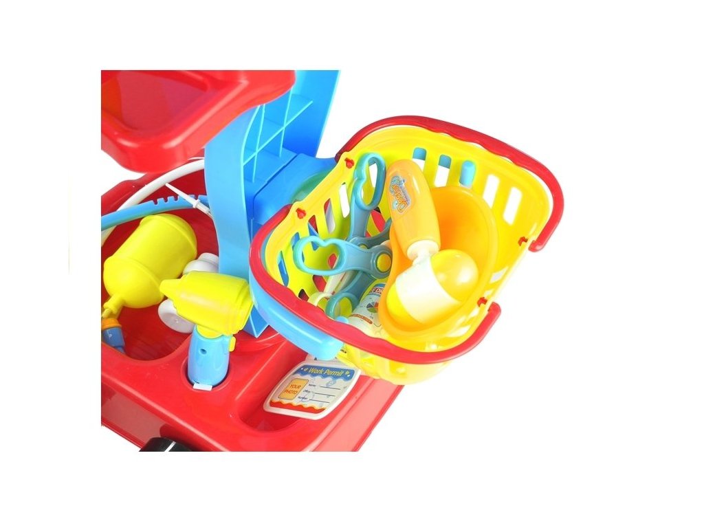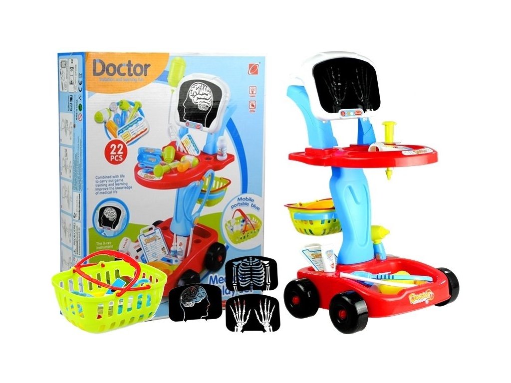 Стабилна Медицинска количка с оборудване, снабдена с многофункционално медицинско оборудване. Медицинската количка, включваща и рентгенови снимки, позволява на децата да научат повече за основните медицински инструменти и човешкото тяло. Медицинският комплект е пълен с медицински уреди, подредени в практична количка на колела, така че децата винаги да имат инструментите под ръка за лечението на своите пациенти.