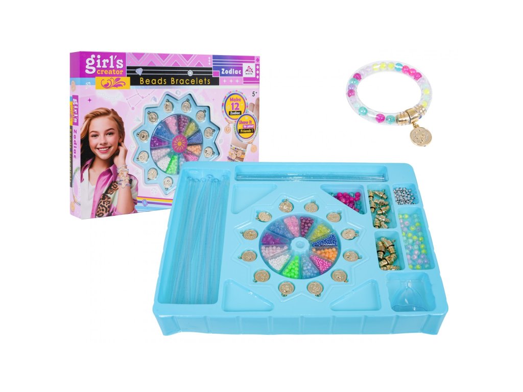 Креативен комплект за изработка на гривни за деца от петгодишна възраст. Богато оборудваният комплект е изработен от най-качествените материали, които са безопасни за деца. Комплектът ще бъде чудесен инструмент за развитие на въображението и творческото мислене. Бижутата, изработени от дете, ще бъдат уникални и неповторими. Комплектът съдържа прозрачни тръбички за изработка на гривни, цветни мъниста и висулки със зодиакални знаци.