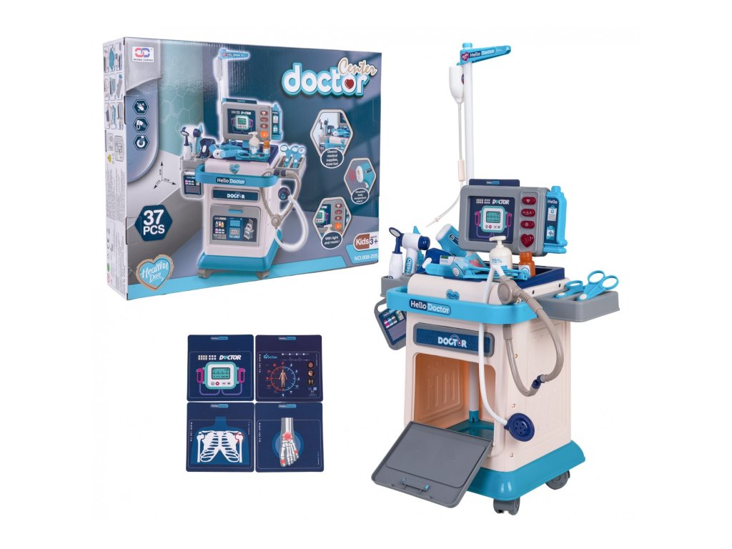 Интерактивен, богато оборудван лекарски комплект със звукови и светлинни ефекти, за деца над три години. Комплектът се състои от здраво изработена, лека количка на колелца с практична дръжка и медицински инструменти. Можем да сменяме рентгенови снимки или томограф. На мониторния дисплей могат да се активират с бутони звуци на сърдечен ритъм, пулс, томограф, както и аларма. Ще светне и бутонът със сърце. Мониторният панел се захранва от батерии тип 2 X AA 1,5 V (не са включени в комплекта). Термометърът се захранва от батерии тип 2 X LR44 (включени в комплекта).