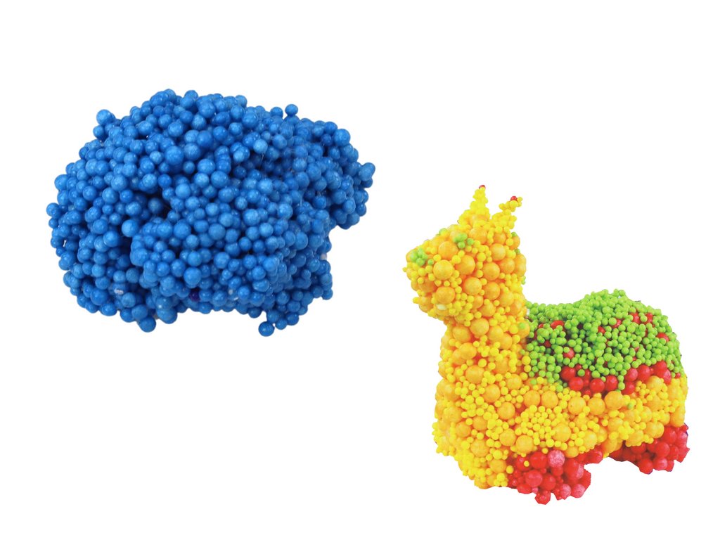 Меки топчета от полистирол в красив син цвят! Тези уникални топчета са удобно съхранени в практична синя чаша и са свързани със специално лепило, което не оставя лепкави следи по ръцете, създавайки единна, лесно оформяема маса.