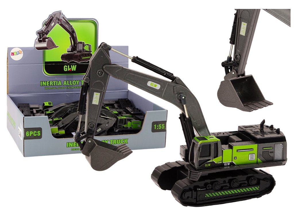 Багерът е в дълбок черен цвят, допълнен с динамични зелени елементи, които му придават отличителен и привлекателен вид. Тези цветове не само привличат погледа, но и създават усещане за здравина и мощ – качество, характерно за истинските строителни машини.