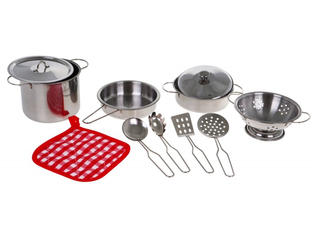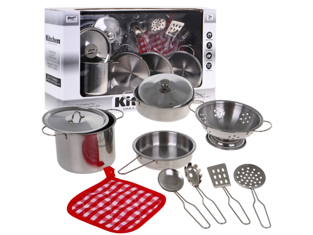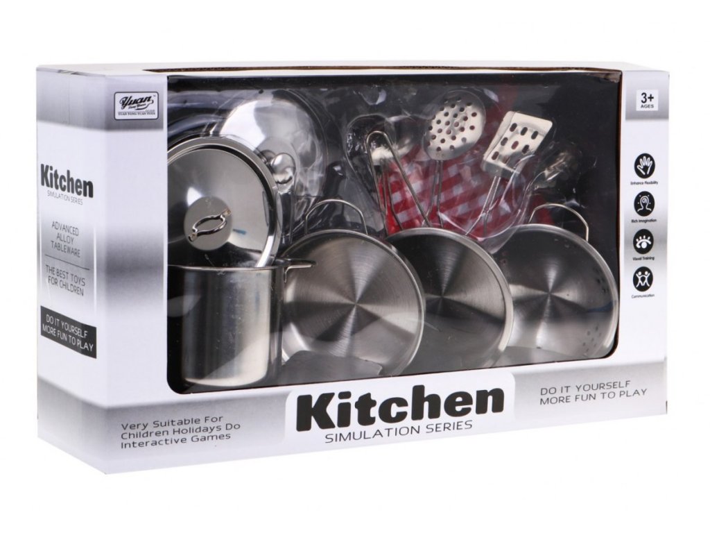 Всяка малка домакиня се нуждае от качествен комплект съдове за своята детска кухня. Подарете на своя малък готвач Метален комплект съдове за детска кухня и ги вдъхновете за готвене и печене на вкусни изкушения. Метален комплект съдове за детска кухня е подходящ за деца над 3 години. Продуктът има CE сертификат за безопасност.