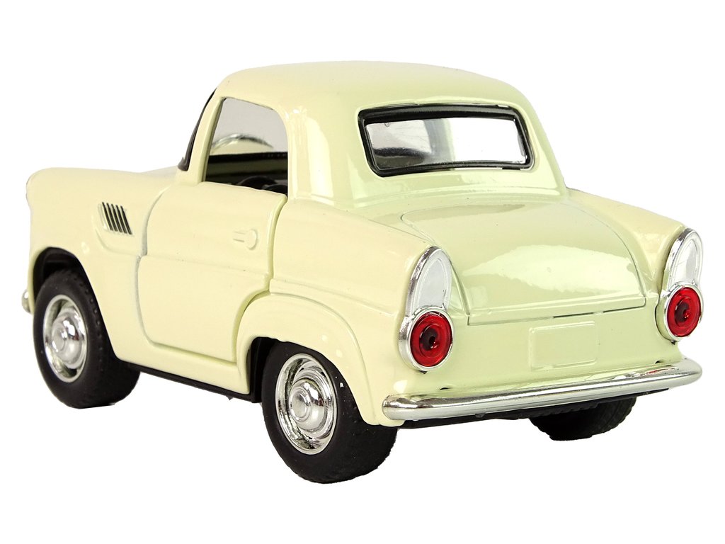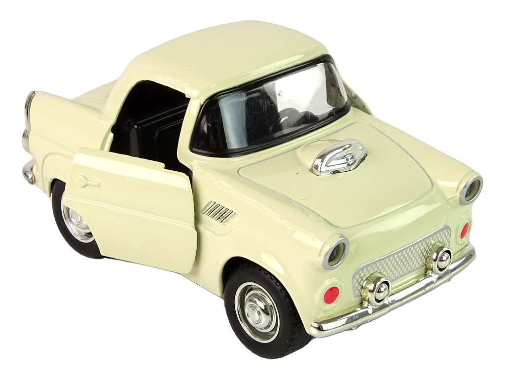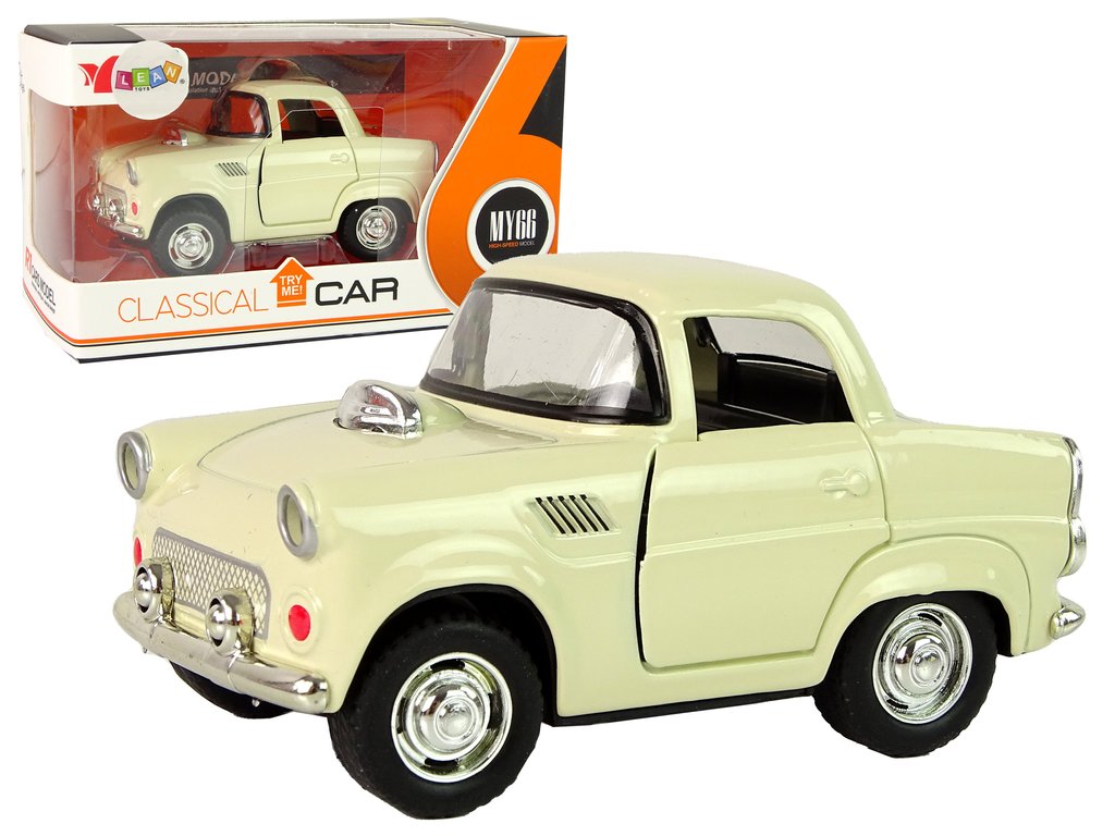 Метална класическа количка с отварящи се врати и звуци е изработена от метал с пластмасова основа. Разполага с гумирани гуми, отварящи се странични врати и интериор, който наподобява истински автомобил. Металният модел на класическо превозно средство е прецизно възпроизведен и изглежда изключително реалистично.