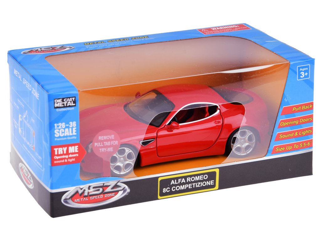 Метална кола Alfa Romeo 8C Competizione 1:32 с ефекти е отличен аксесоар за колекционери на модели автомобили. Този автомобил е изработен с внимание към детайла и естетика, което ще зарадва всеки малък шофьор. Разполага с отварящи се врати, звукови и светлинни ефекти и задвижване с дръпване, което позволява бързо ускоряване при избутване назад по гладка повърхност.