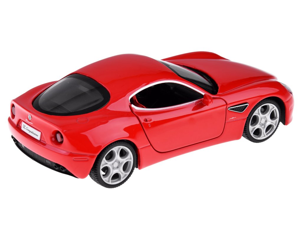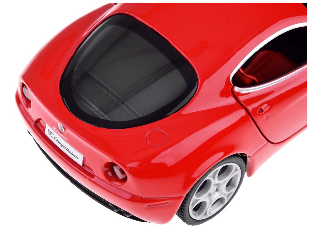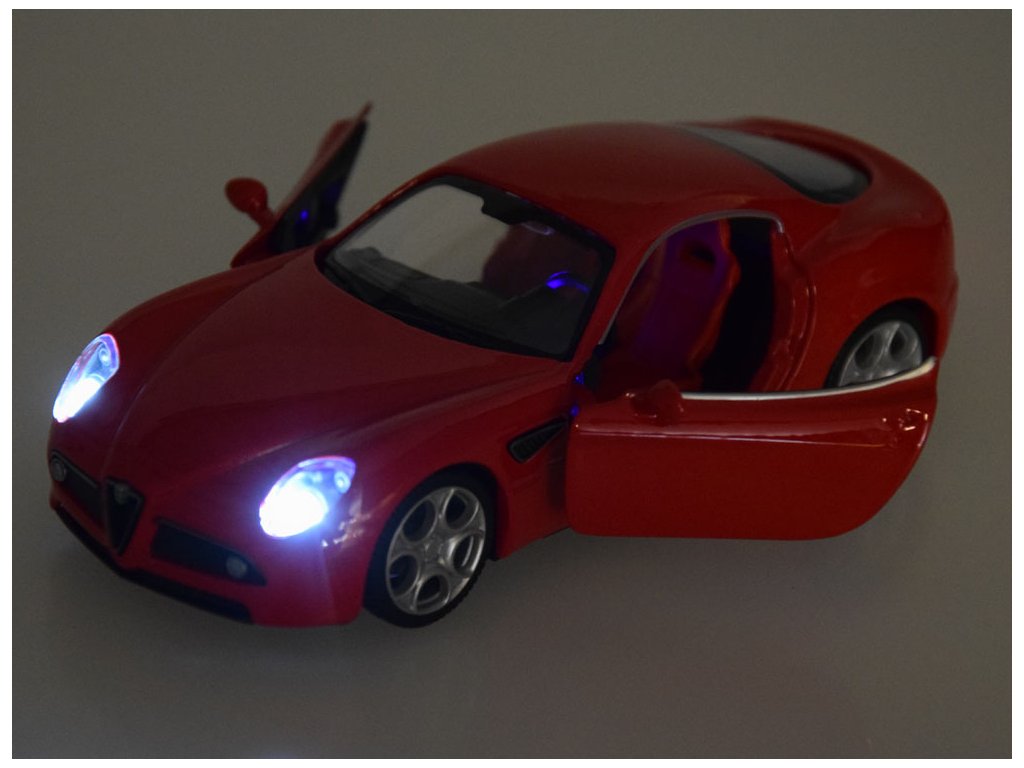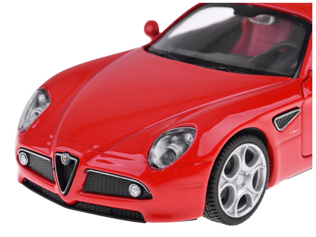 При отваряне на вратите на Alfa Romeo 8C ще чуете звук на сирена и клаксон. Когато натискате колата напред, ще чуете звук на стартиране и работа на двигателя. Тези звукови ефекти се допълват от предни и задни светлини, както и осветен табло. Моделът има метално купе, гуми от каучук и пластмасова рамка.