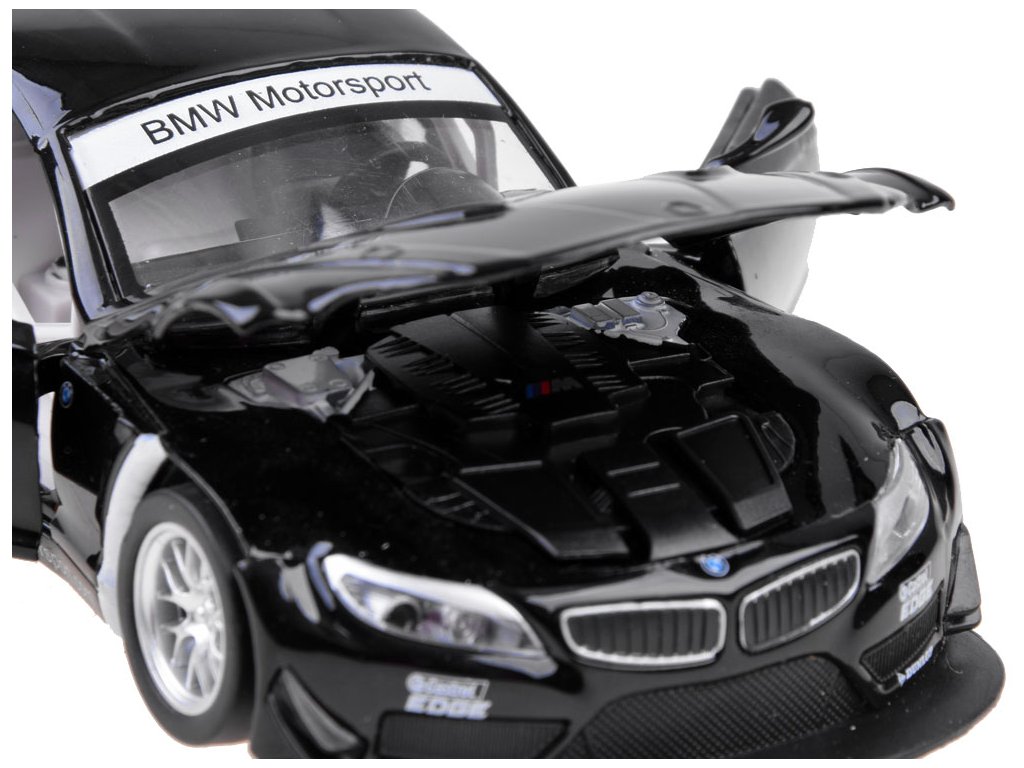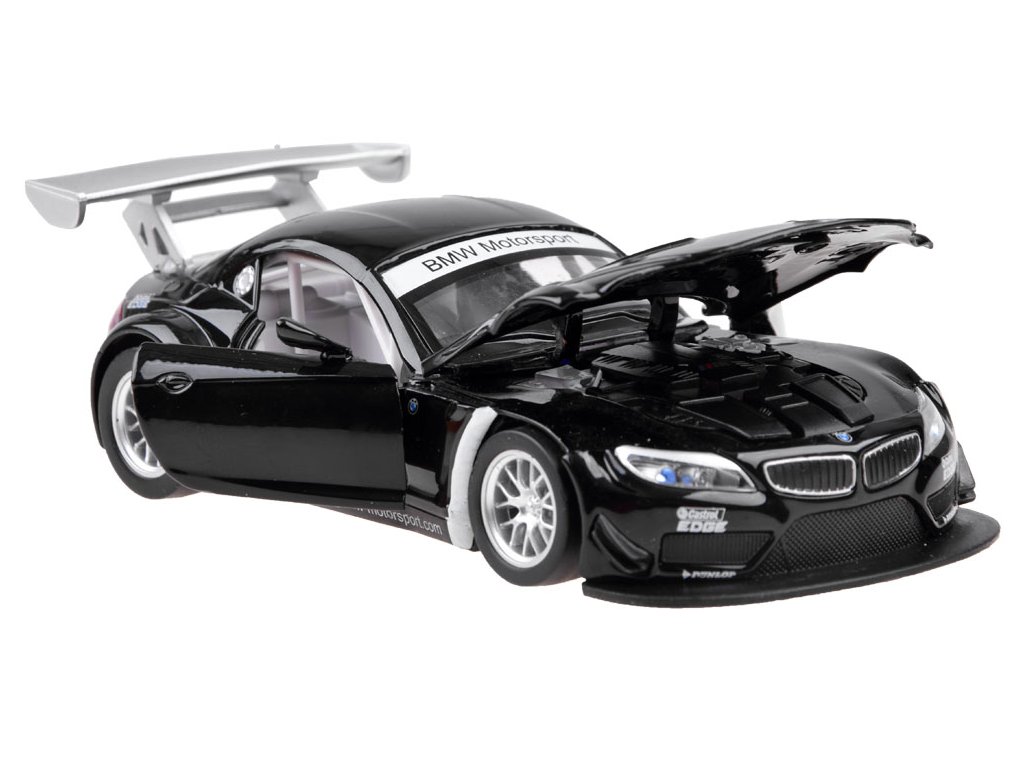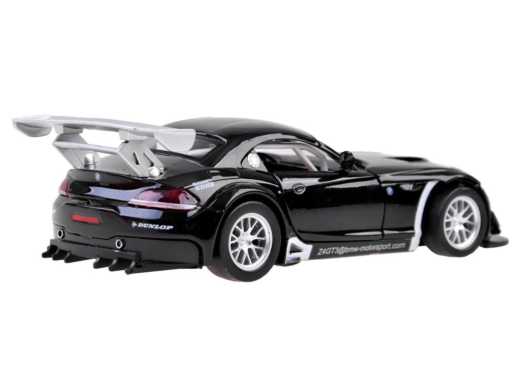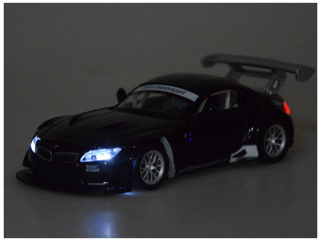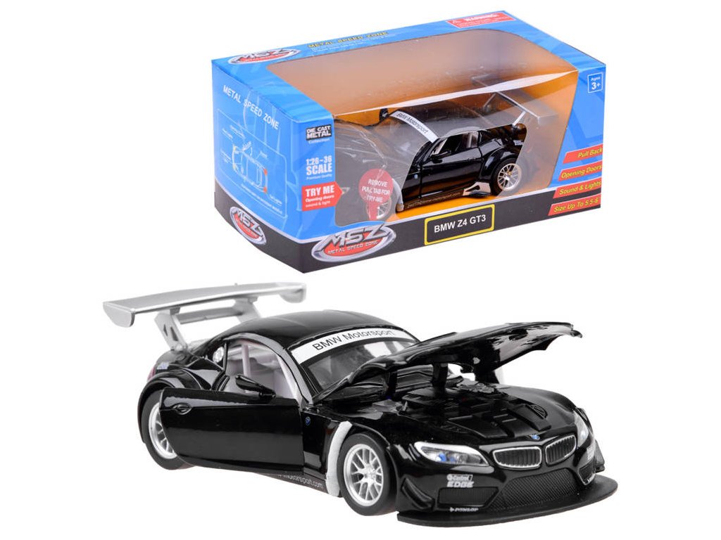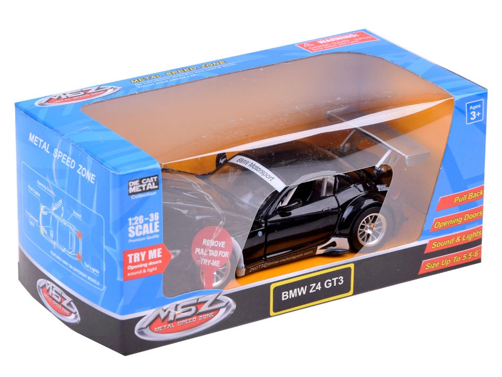 Металната кола BMW Z4 GT3 предлага множество предимства, които ще зарадват децата. При отваряне на вратите се включва аларма със синхронизирано мигащи светлини. Колата издава звуци на стартиращ двигател и шумове при движение, когато се постави върху повърхност. Светлините отпред и отзад започват да мигат, придавайки реализъм на играта. Купето е изработено от метал, гумените колела осигуряват добър контакт с повърхността, а шасито е от пластмаса.