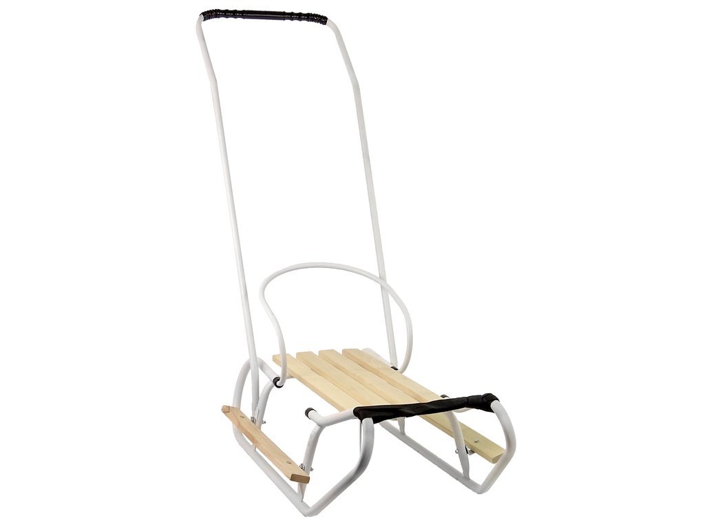 Метални шейни с бяла дръжка за бутане са изработени от дърво и метал, което ги прави здрави и устойчиви, но в същото време удобни и не твърде тежки. Дървена дръжка за бутане и облегалка могат лесно да се свалят.