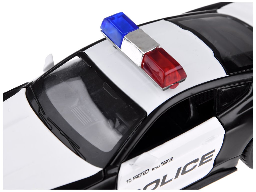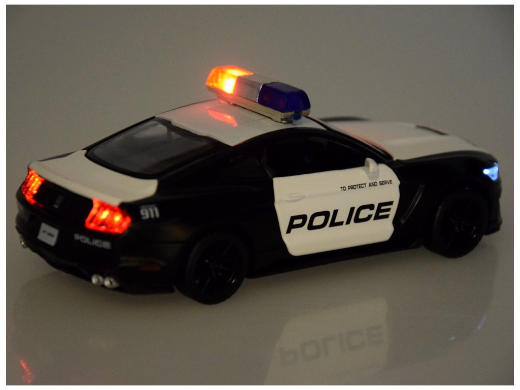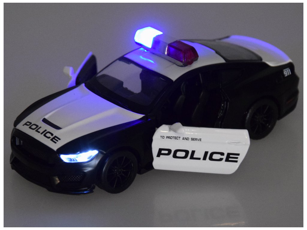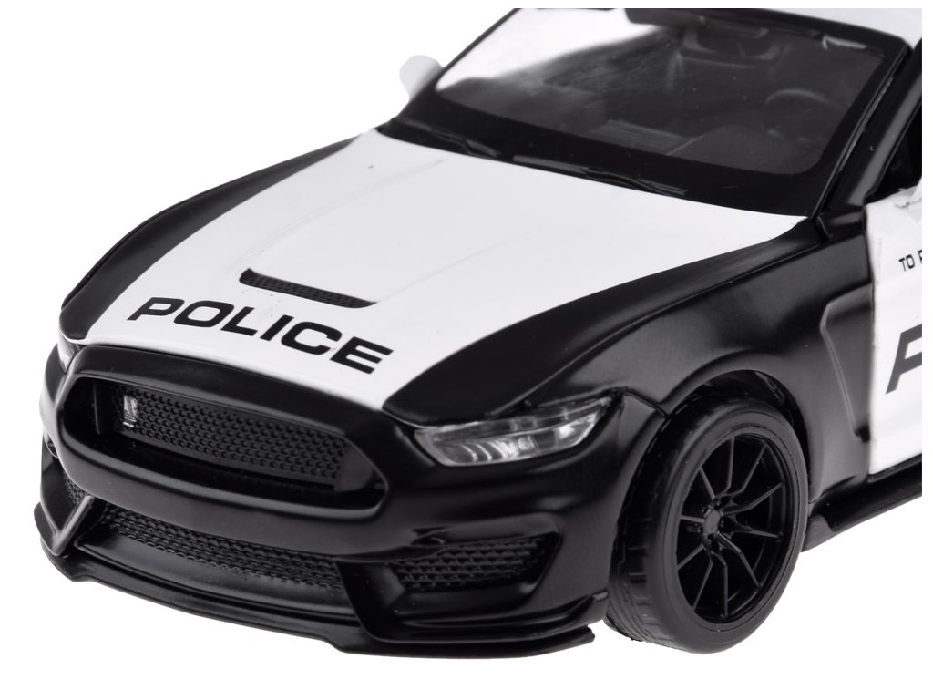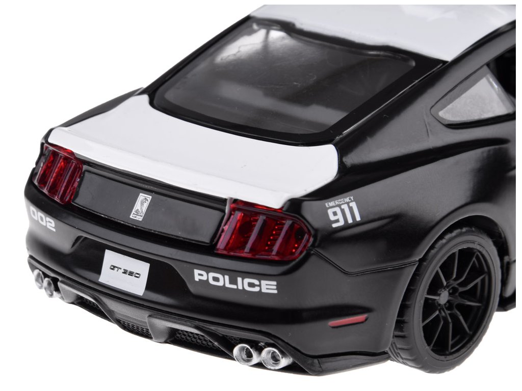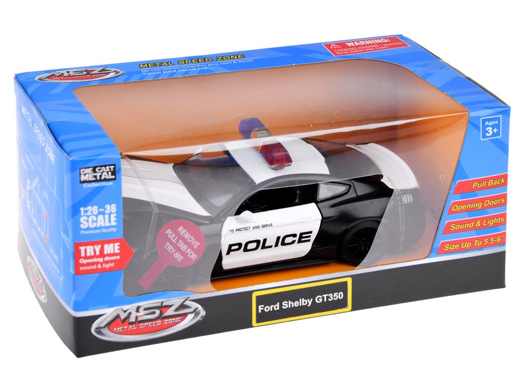 При отваряне на вратите и приближаване на полицейското автомобилче Ford Shelby GT350 ще чуете звукови сигнали. Към звуковите ефекти се добавят светлини отпред и отзад, както и мигащи сирени на покрива. Цялото тяло на автомобила е метално, гумените колела и пластмасовото шаси гарантират здравина и функционалност.