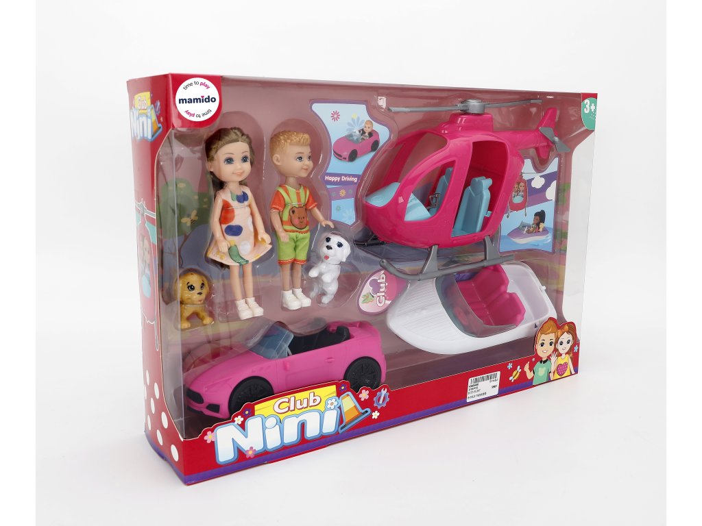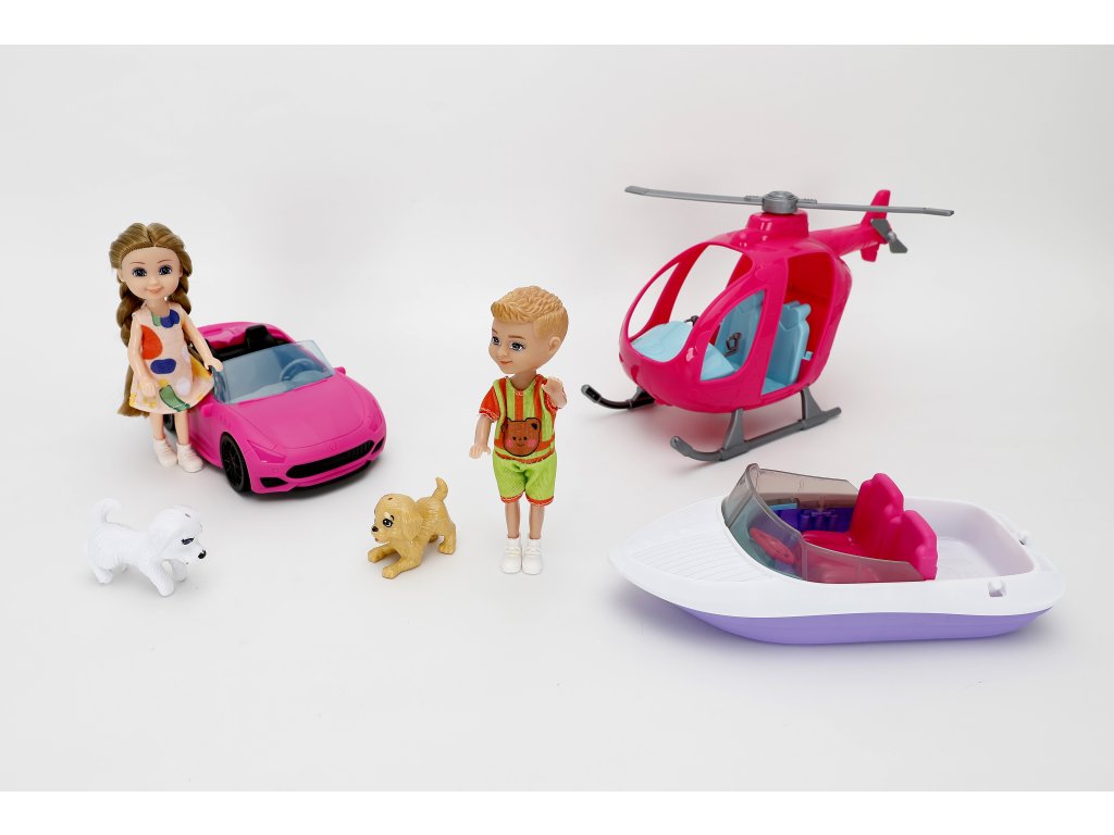 Комплектът включва две кукли, кола, лодка, хеликоптер, кучета и аксесоари, които позволяват безкрайни комбинации от игри. Благодарение на компактния си размер, той е подходящ както за дома, така и за пътуване.