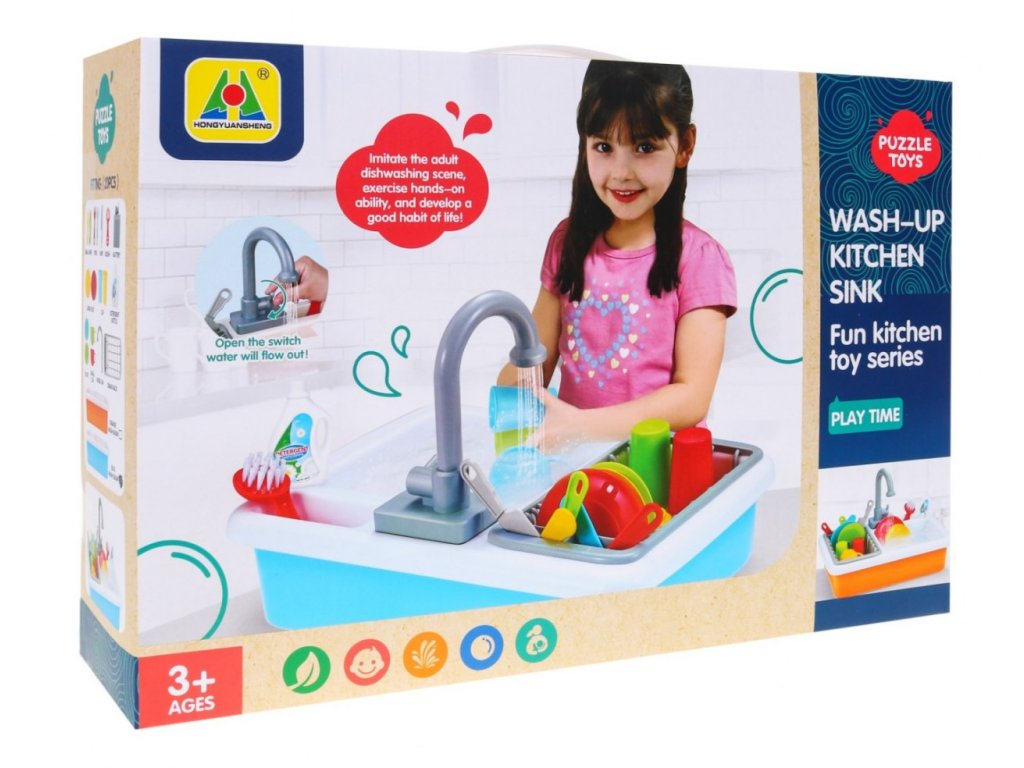 Мивка с течаща вода Home and Kitchen е забавна игра както за момичета, така и за момчета. Отличен начин да научите детето на домакински отговорности и подреждане. След напълване на резервоара с вода, запечатване и включване на кранчето, водата започва да тече. Водният поток е слаб, така че няма опасност от разливане и безпорядък.