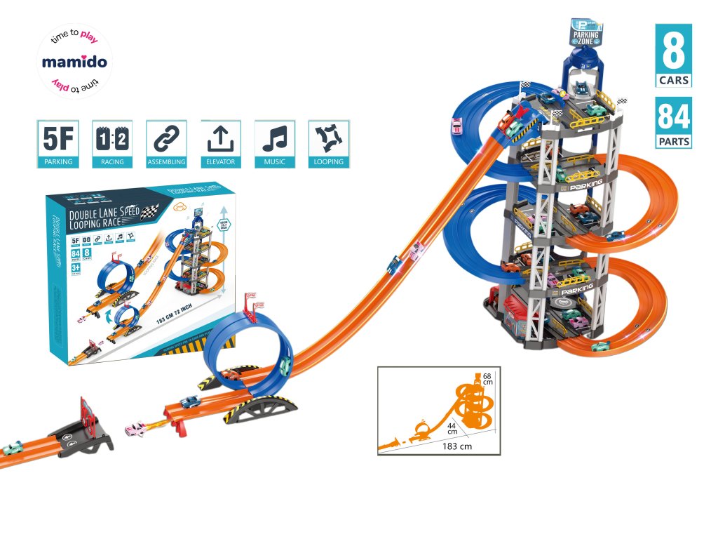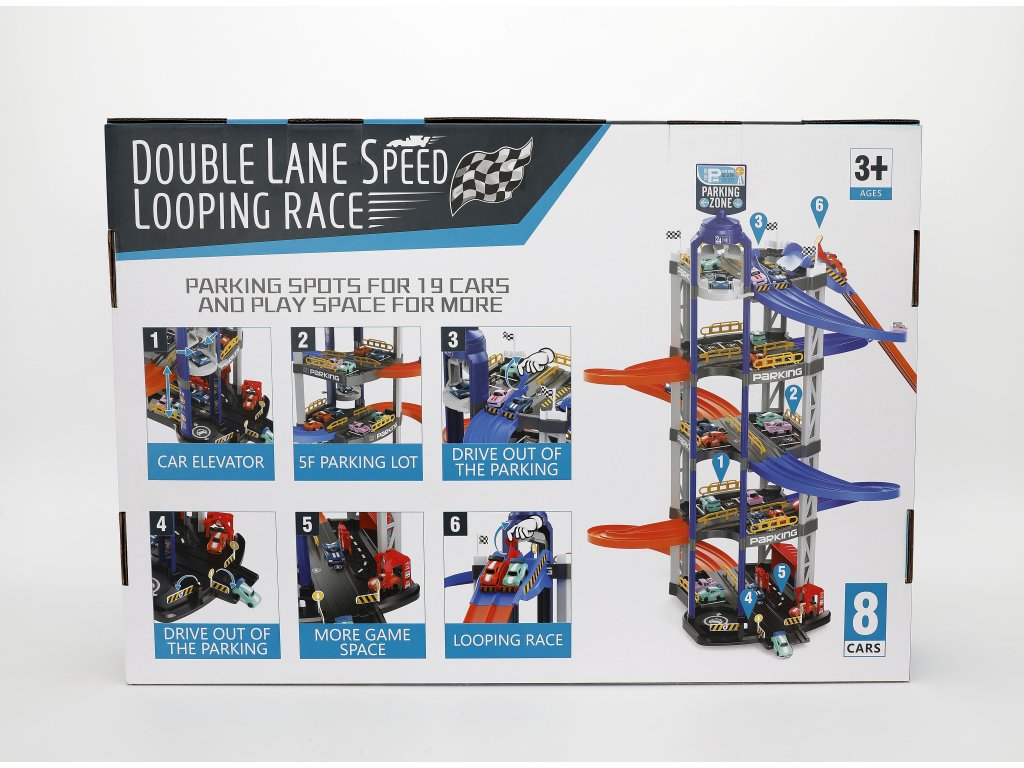 Супер екшън състезателен комплект за малки любители на скоростта. Тази 5-етажна състезателна гаражна клетка с двойна състезателна писта предлага вълнуващи пътувания в лопинг, паркиране на множество нива, асансьор за колички и интерактивни звукови ефекти. Общо 84 части и 8 колички в комплекта – идеален комплект, който забавлява дълго и винаги има какво да се открива. Пистата е дълга до 183 см и достига височина 68 см.