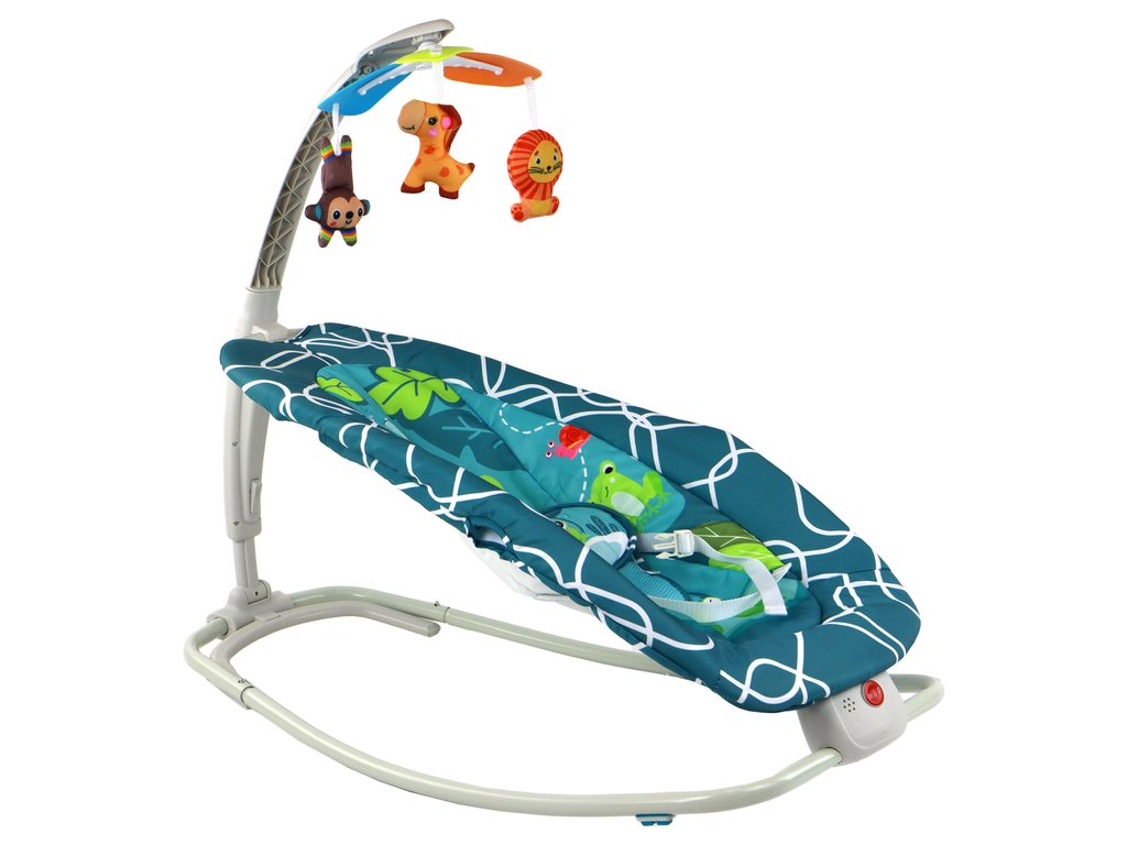 Многофункционален люлеещ се шезлонг 2в1 с жабка с звуци и вибрации е практично решение, което осигурява на вашето дете забавление и релаксация. Той комбинира удобен шезлонг и люлка в едно.