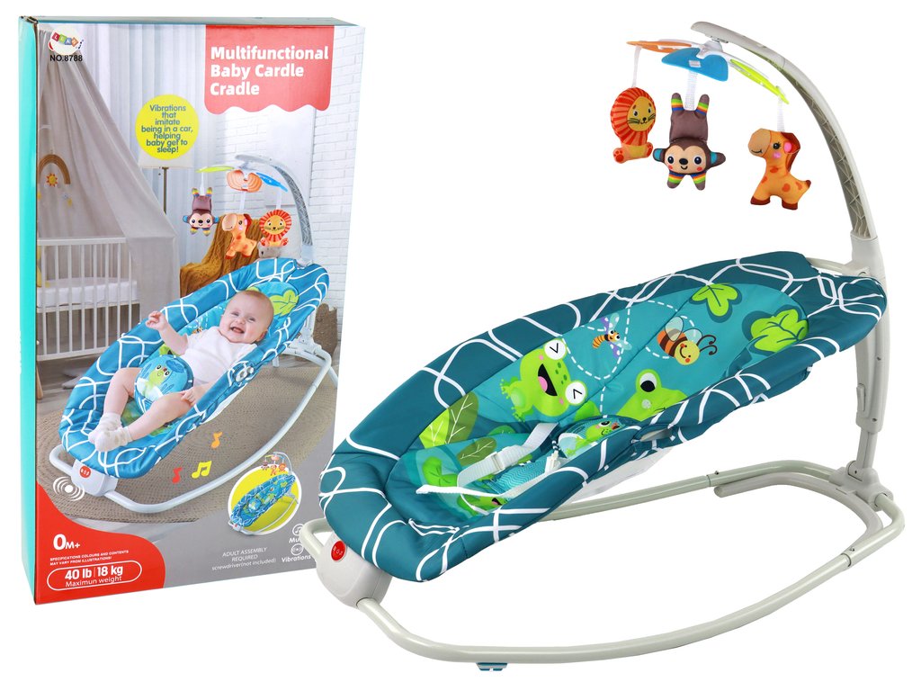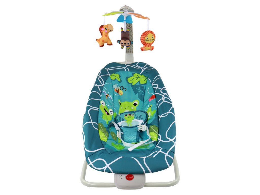 Комплектът включва подвижна диадема с въртележка с меки и симпатични играчки. На въртележката с дрънкалка има три животинчета: лъв, маймуна и жираф, които чудесно стимулират сетивата на бебето. Шезлонгът носи и весели жабки, изрисувани върху материята, които предоставят забавление на детето.