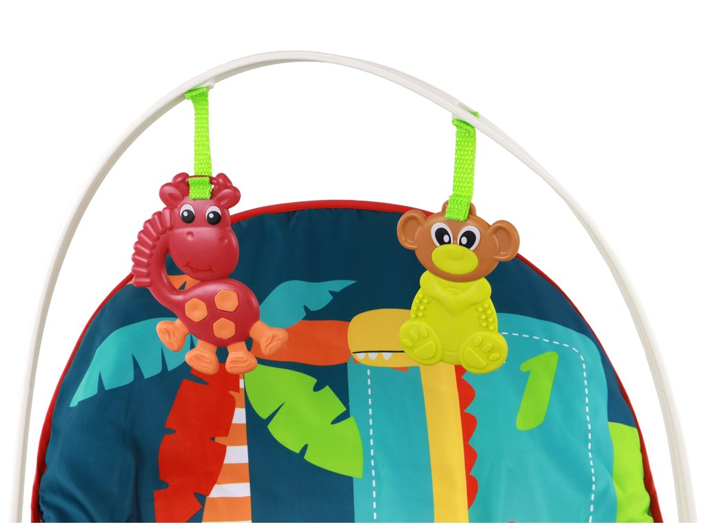 Комплектът включва подвижна лента с артистични играчки от качествен пластмасов материал в комбинация с гума, като маймунка и жирафка, които отлично стимулират сетивата на бебето. Шезлонгът е декориран с весели динозаври, които се появяват върху материята и създават забавна атмосфера за детето.